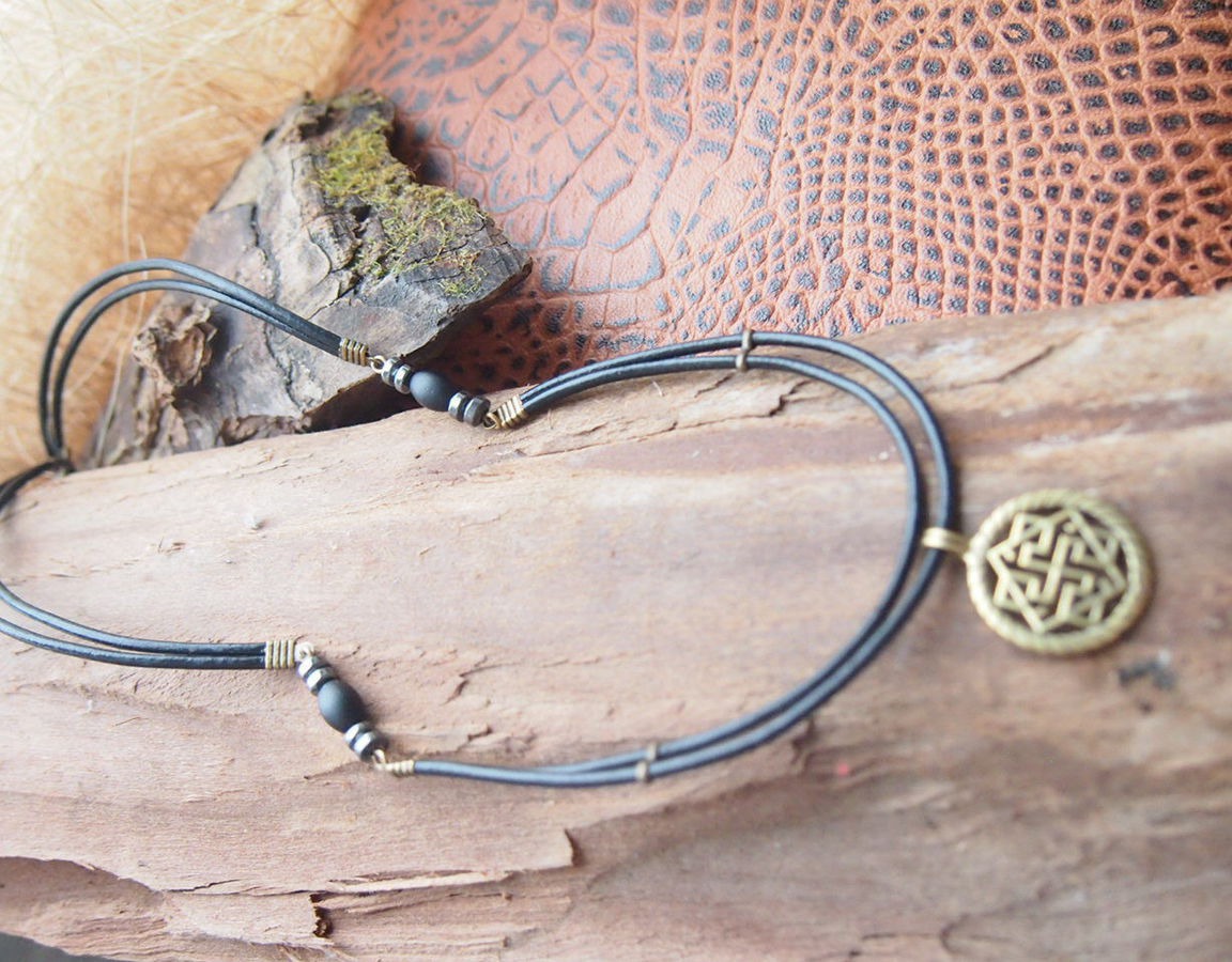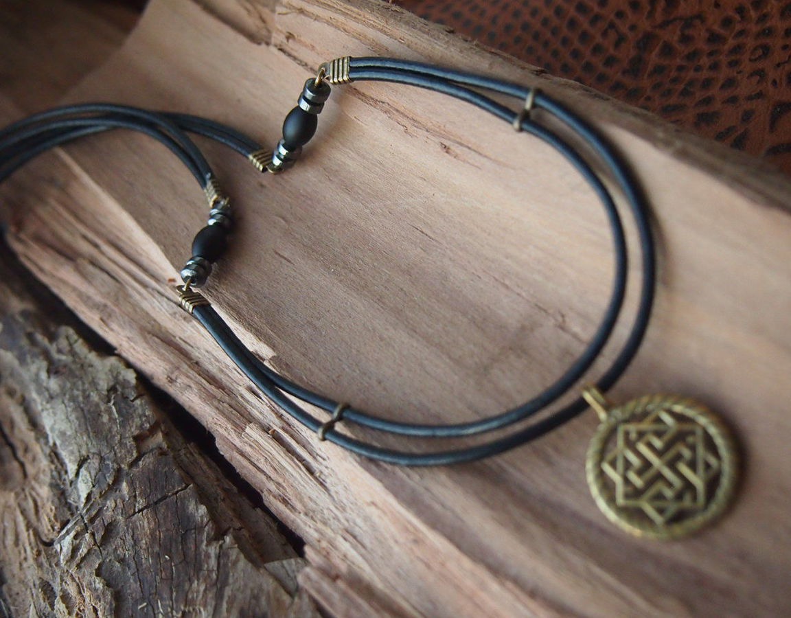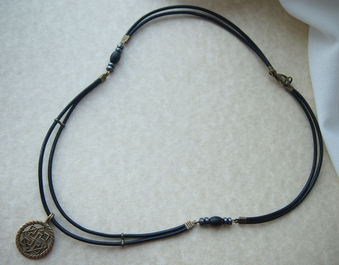 Двойной кожаный шнур со вставками шунгита и гематита. Очень интересный по форме, хорошо лежит на шее, можно носить как на теле, так и поверх одежды.