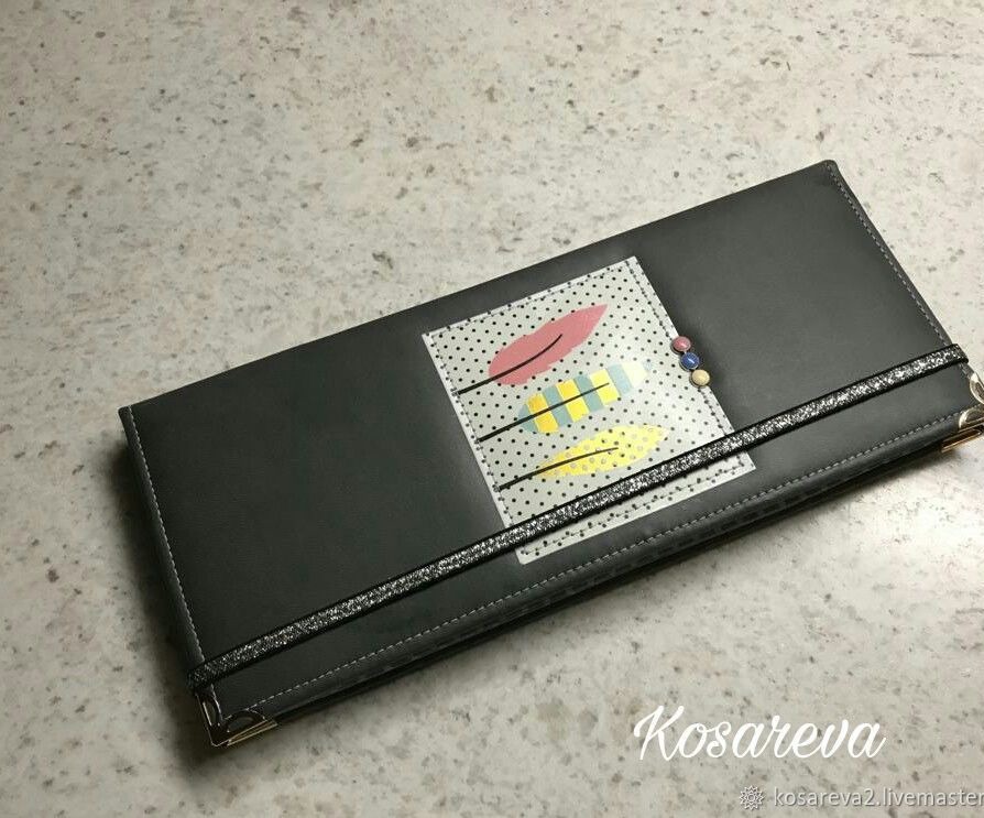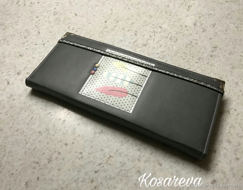 Серый кожзам отличного качества,внутри тканевые кармашки, закрывается на резиночку, чтобы ничего не потерялось.