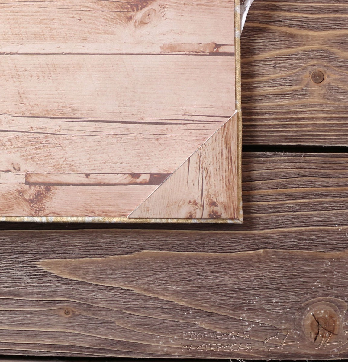 Мягкая тканевая обложка, закрывается на резинку. Внутри место для фото в рамке. На лицевой стороне рамка под золото из пластика.