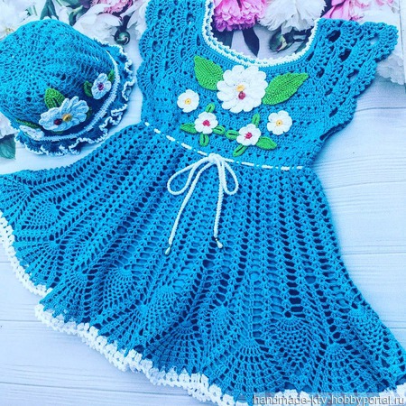 Платье и шляпка голубого цвета из 100% детского хлопка связаны крючком красивыми узорами на лифе и юбочке, юбочка книзу расклешенная, имеет подклад из х/б ткани, по линии талии поясок, на лифе и шляпке аппликация цветочки и листики. Изделие прошло ВТО //стирка//, накрахмалено.