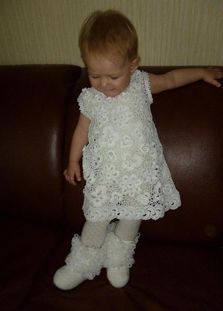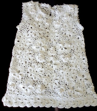 Платьице ручной работы для малышки. Связано из 100% хлопка белоснежного цвета по технологии ирландского и брюггского кружева и расшито жемчужными бусинами.