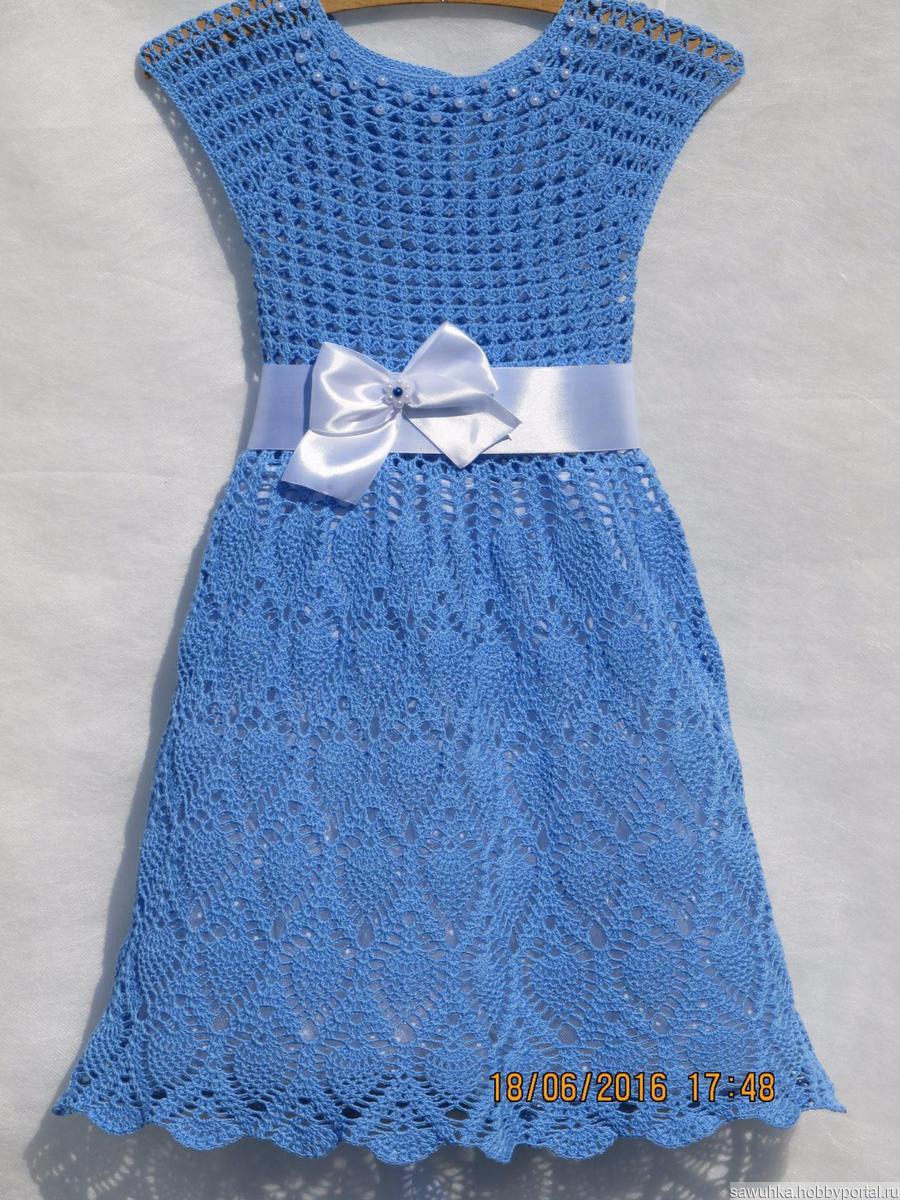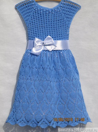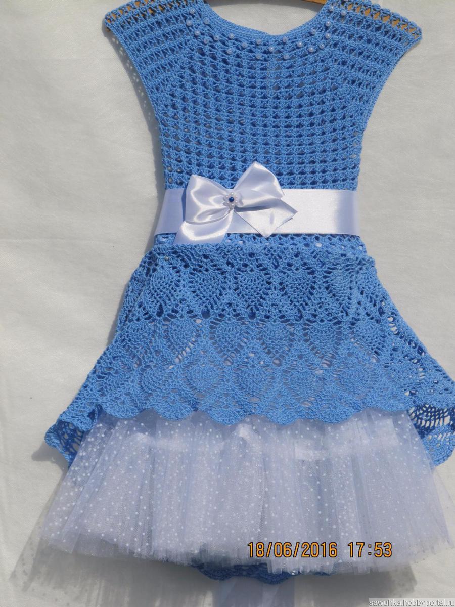 Платье крючком голубого цвета для торжества . Горловина украшена бусинами . Поясок из атласной ленты декорирован бантиком . Бантик отстегивается .Пышный подъюбник из мягкого фатина .