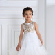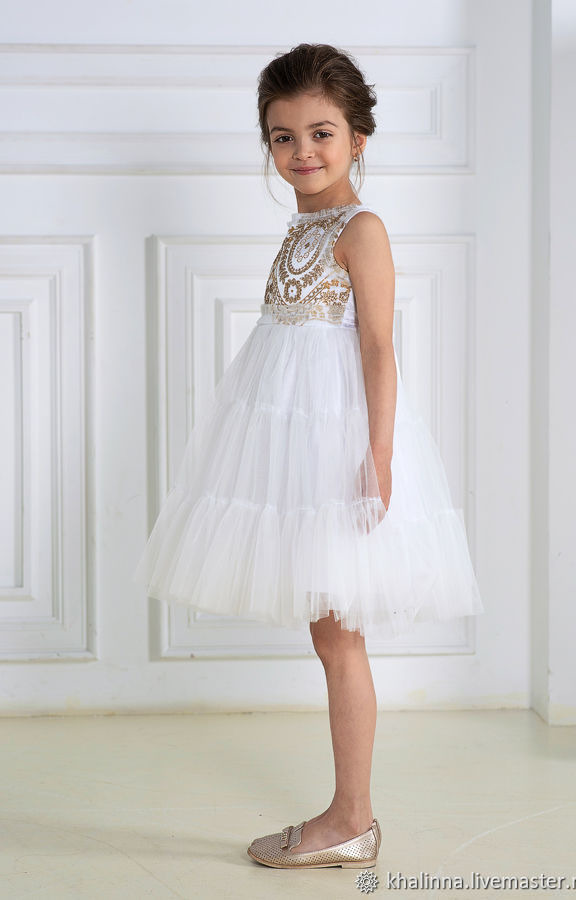 Платье белого цвета выполнено из креп-сатина. Полочка двойная. верх сетка с золотым узорным напылением в виде красивого орнамента. Подклада 100% хлопок. Низ платья сетка многослойная, пышная