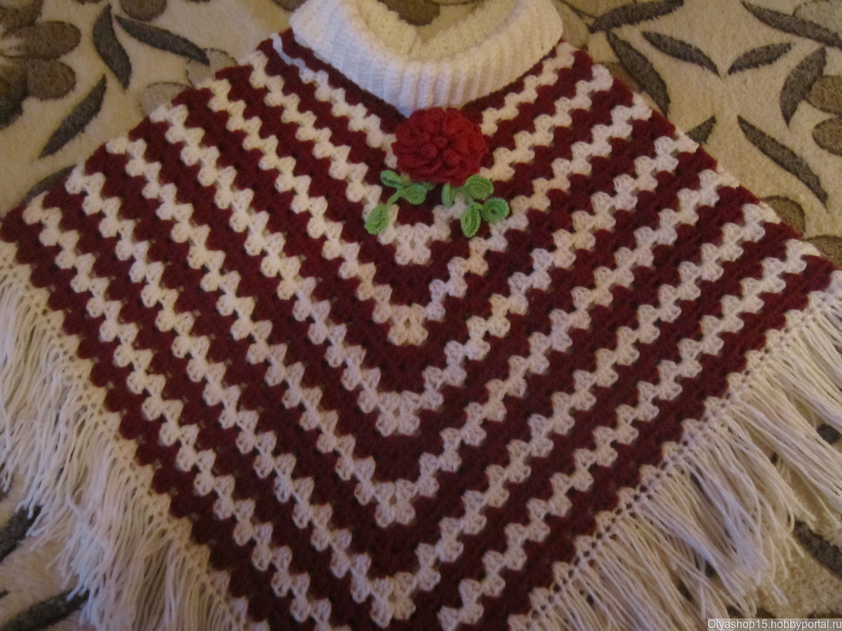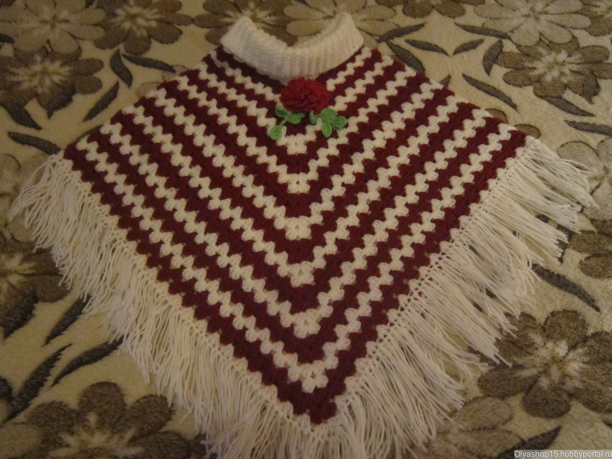 Пончо вязано из 50% акрила и 50% шерсти. Любой расцветки и размера. Из любой пряжи. Вязанный крючком . Горло вязано резинкой. Украшен вязанным цветком и листьями. Цена заказа зависит от размера изделия. Пожелания учитываются при заказе.