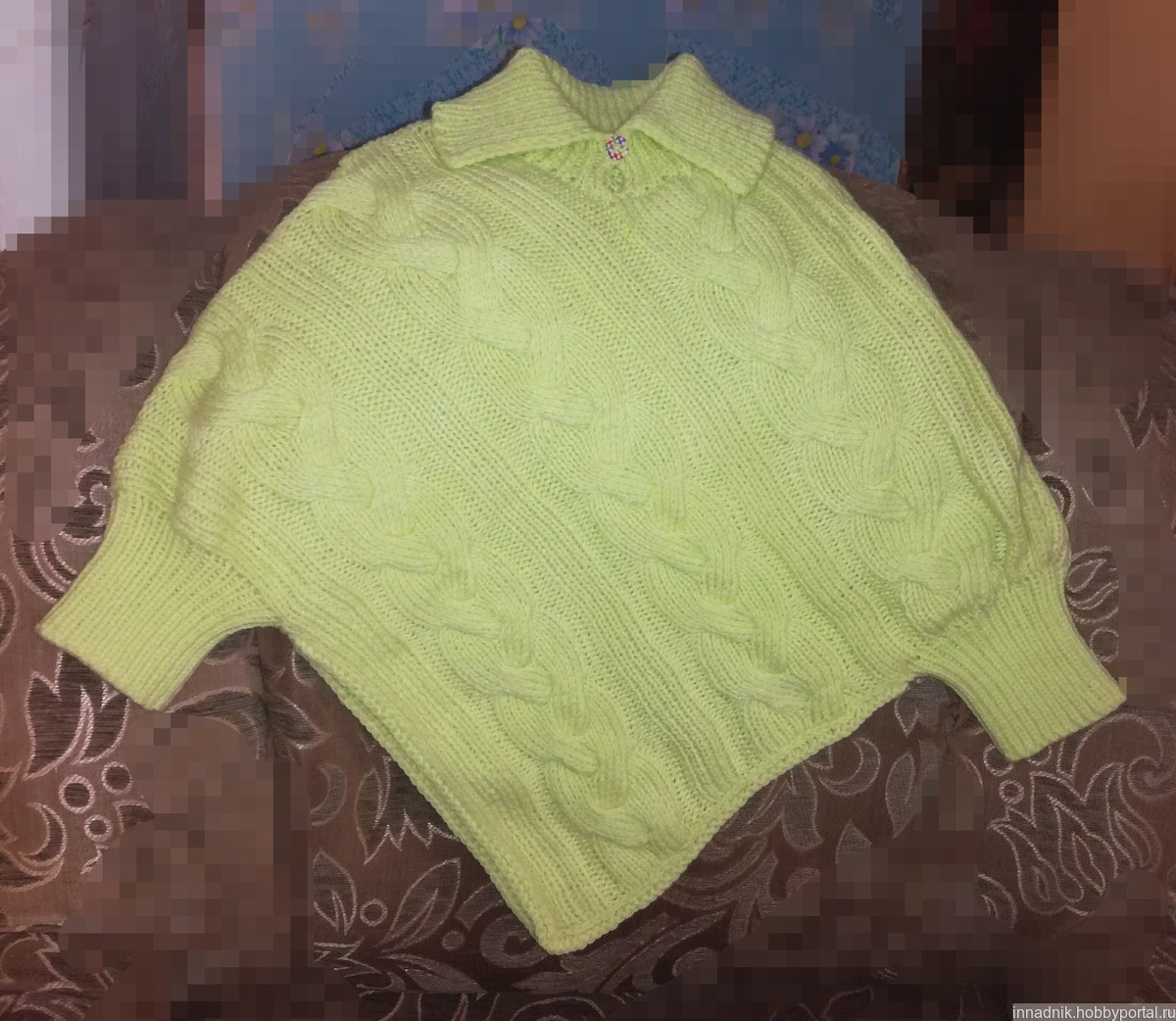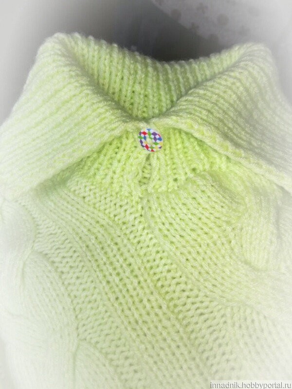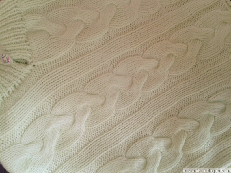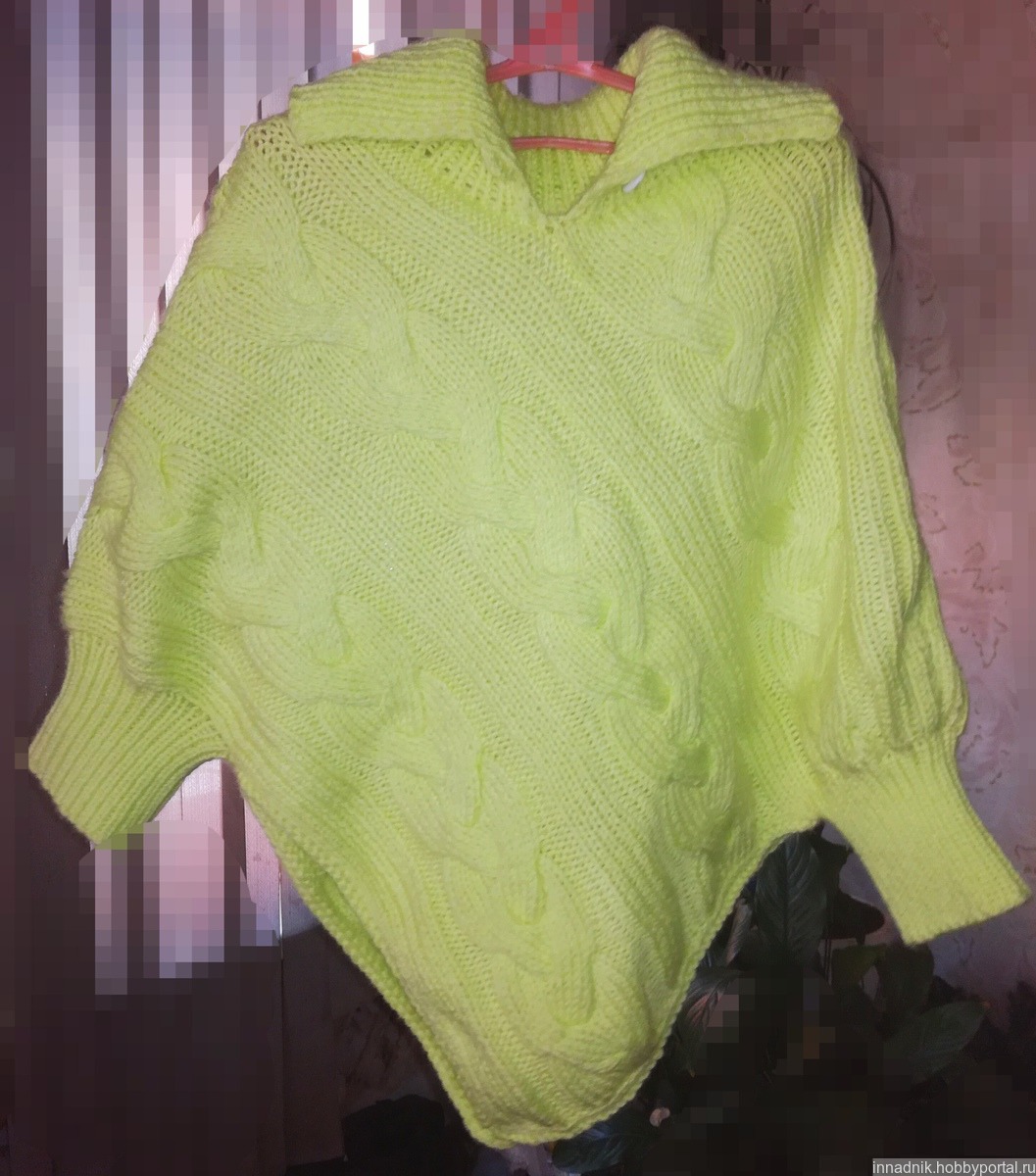 Пончо с рукавами, воротник с застежкой, узором из кос. Для девочки 5-6 лет.