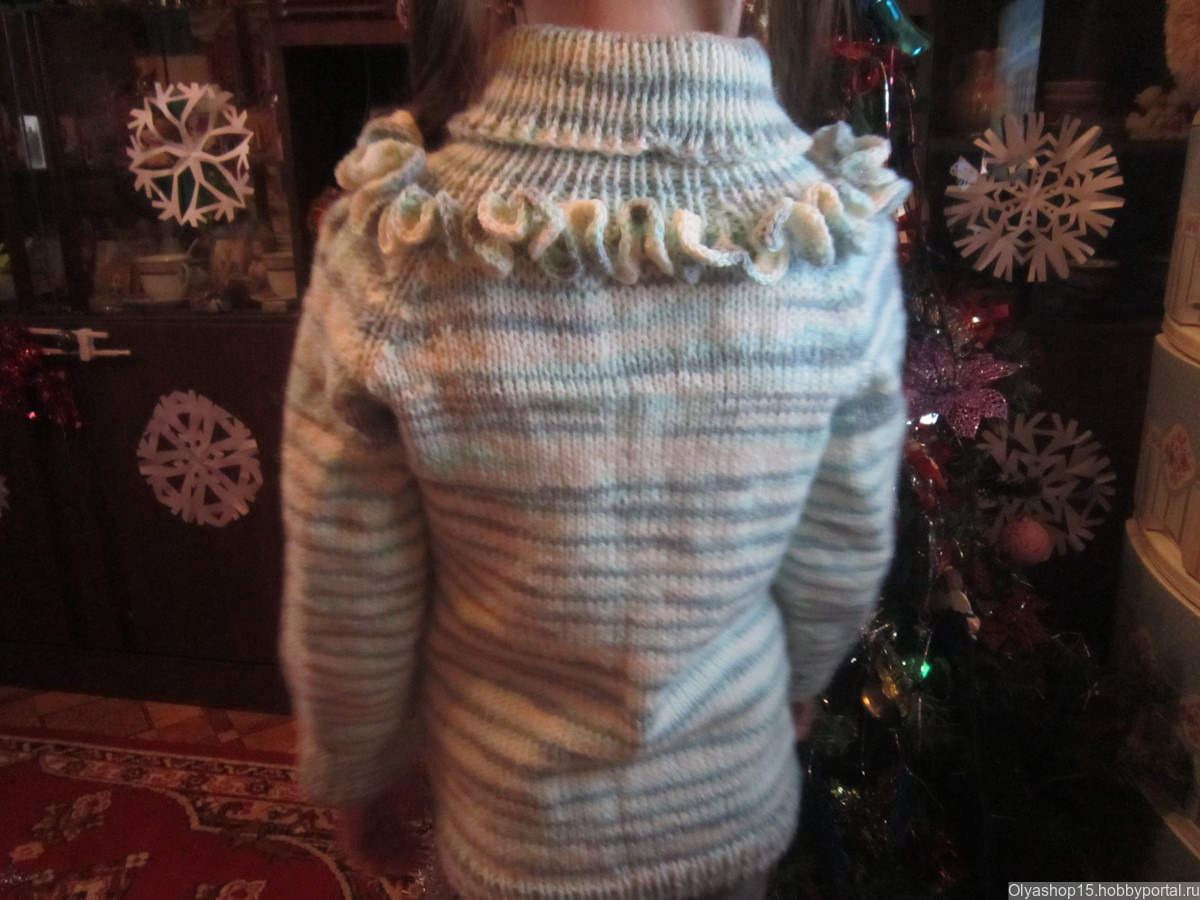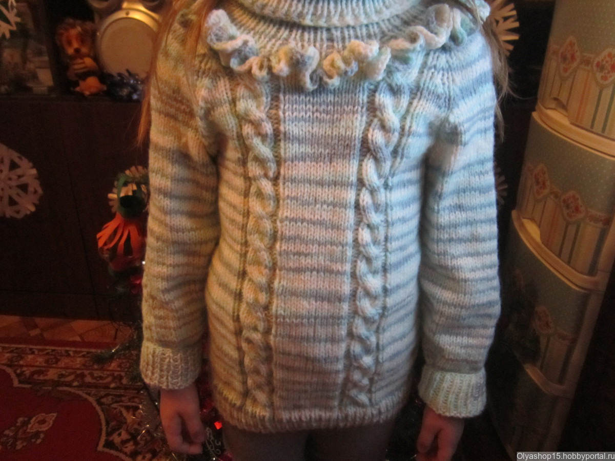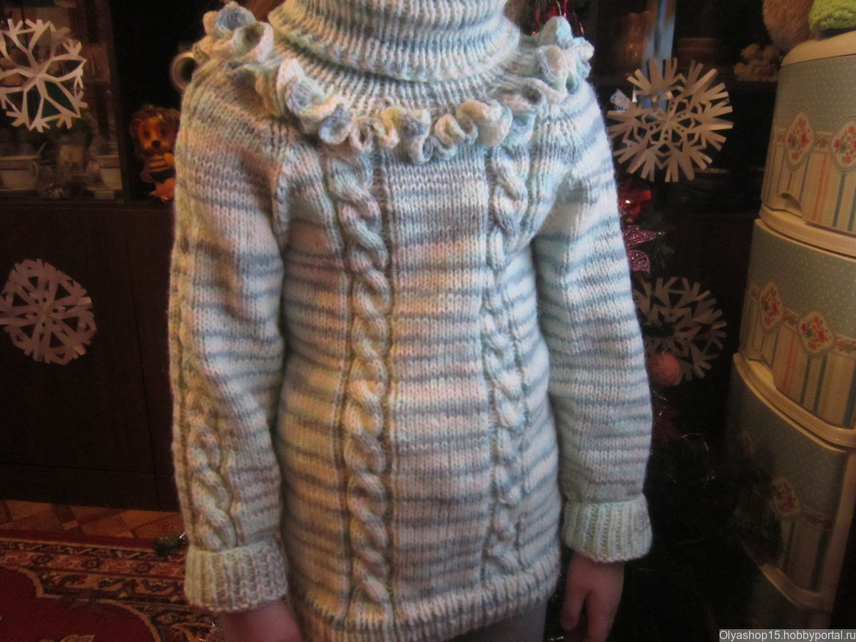 Свитер на девочку 5-6 лет. Узор - двойная коса. С горловиной. Отделка вязаными рюшами. Теплый - 50% акрил, 50% шерсть. Расцветка любая. Пряжа и рисунок по желанию заказчика. Изготовление - 3 недели.