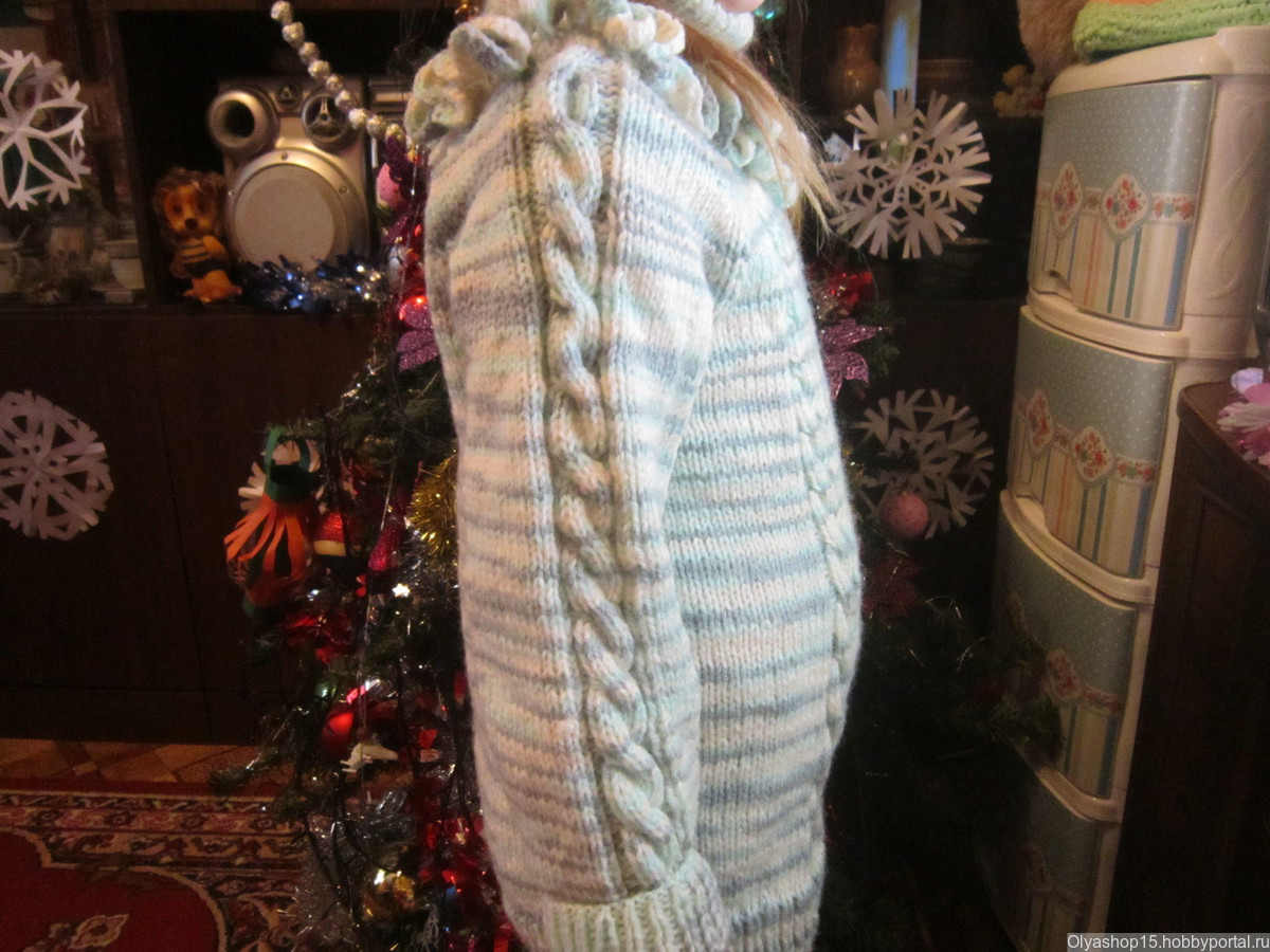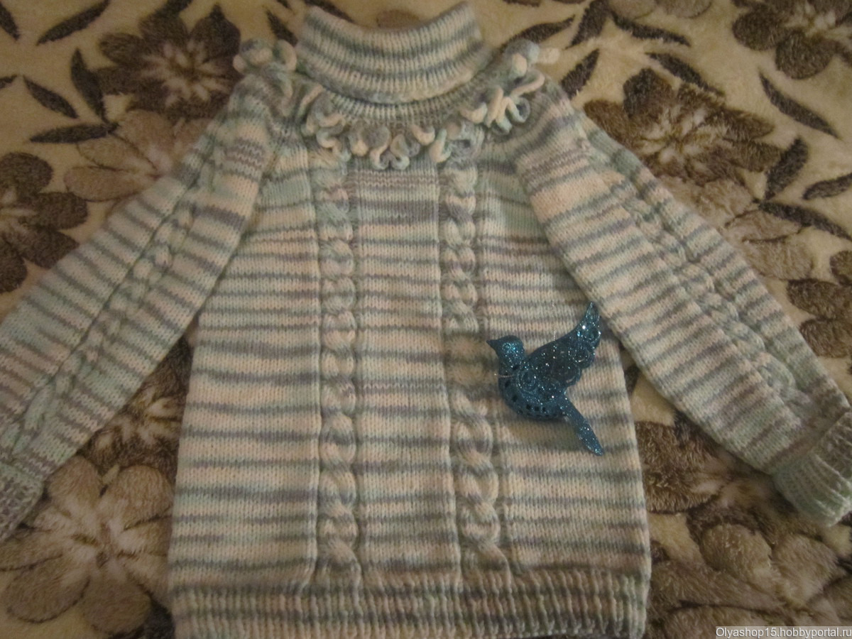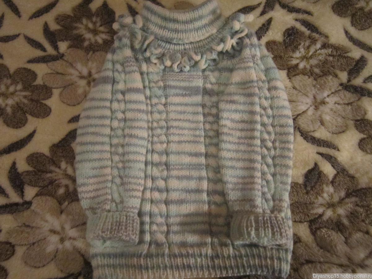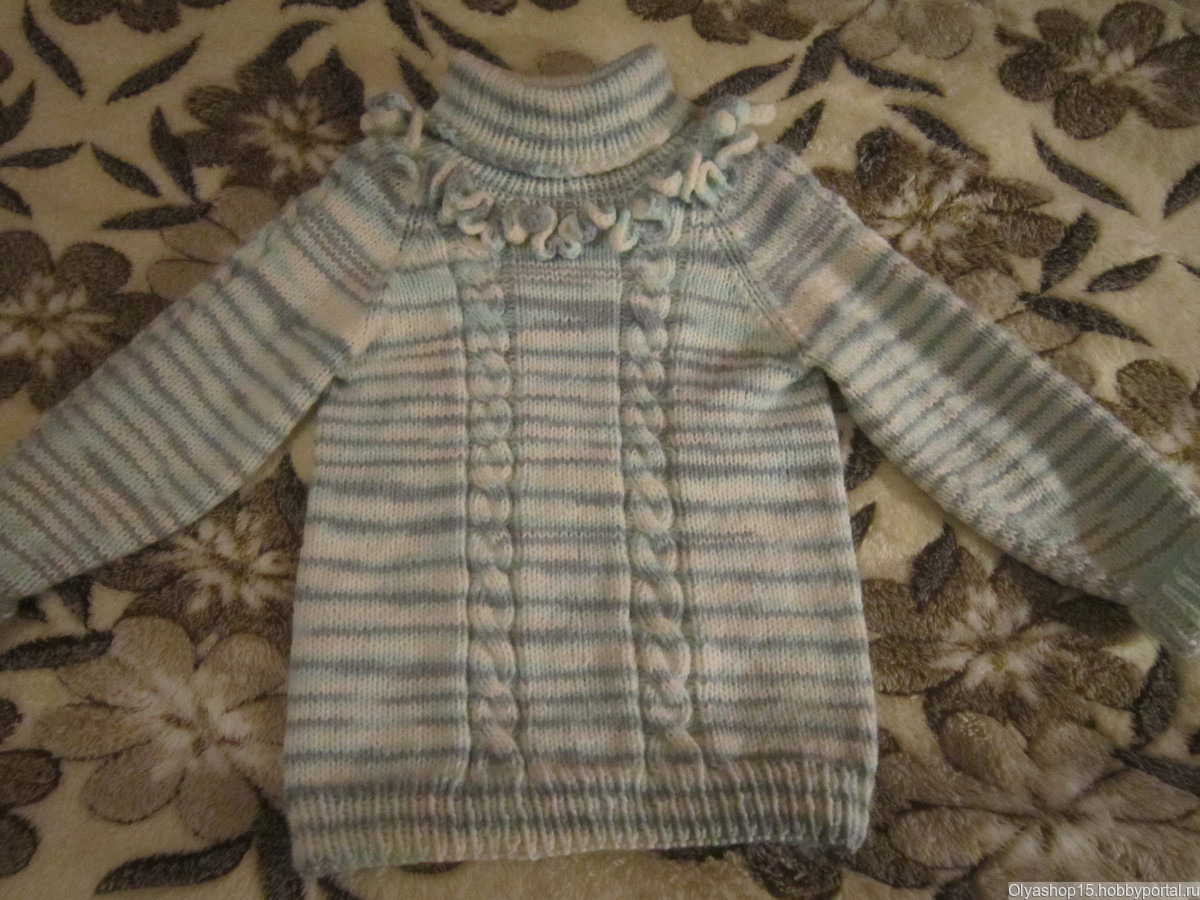 Свитер на девочку 5-6 лет. Узор - двойная коса. С горловиной. Отделка вязаными рюшами. Теплый - 50% акрил, 50% шерсть. Расцветка любая. Пряжа и рисунок по желанию заказчика. Изготовление - 3 недели.