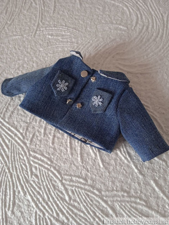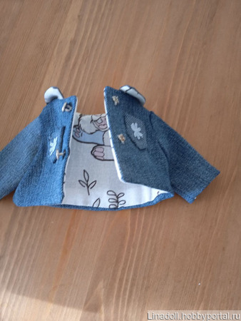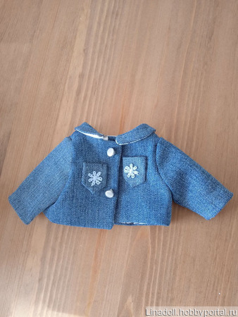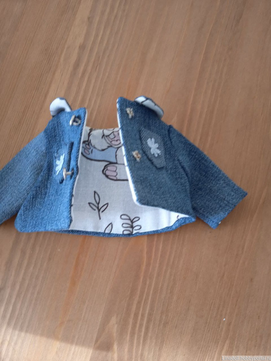 одежда для куклы, куртка для куклы, кукла ручной работы, игрушка для ребенка, джинсовый стиль, пуговицы декоративные, аппликация вышитая, кнопки металлические