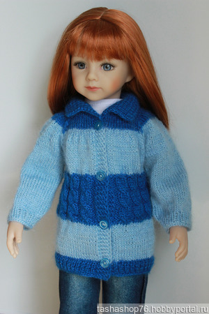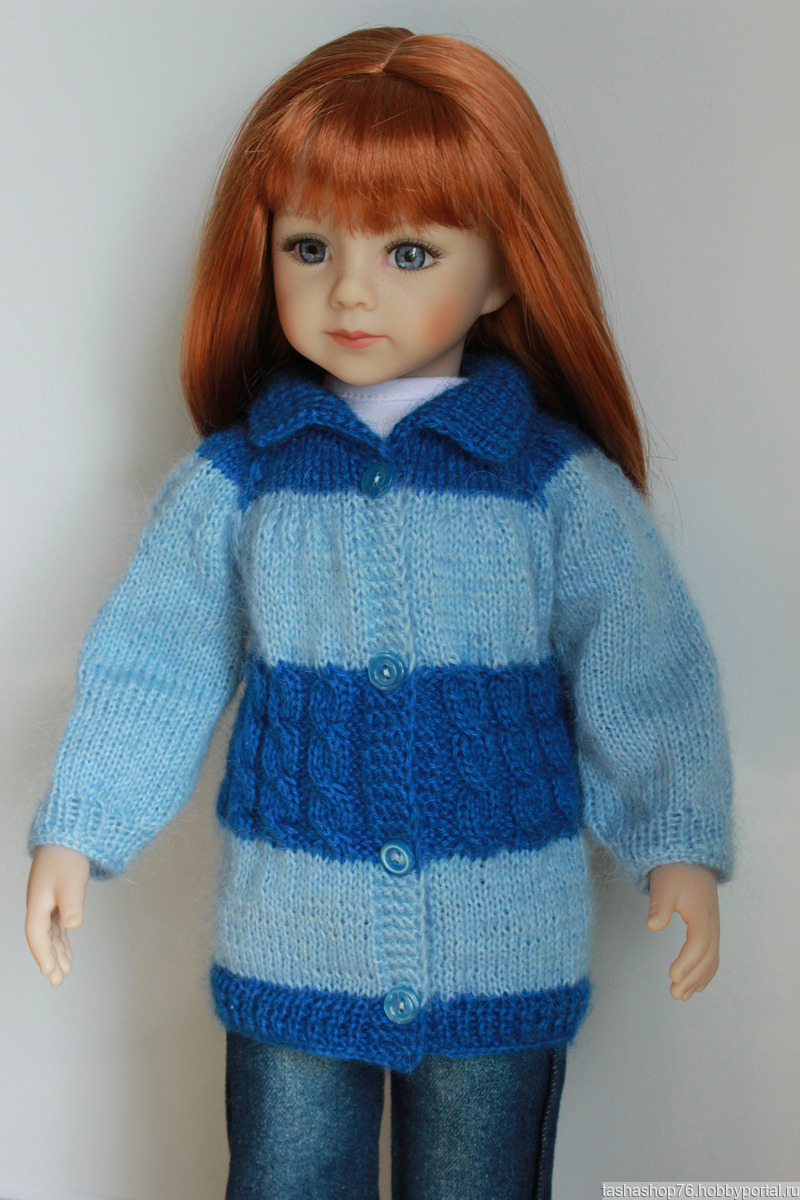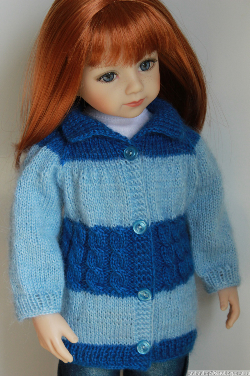 Кардиган связан на спицах, бесшовный, подходит куклам Gotz(Готц) и другим похожего размера.