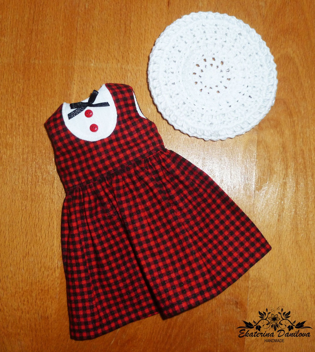 Платье выполнено из импортного хлопка в мелкую клетку, украшено бантиком из атласной ленты и пуговицами. Лиф на подкладке. Все швы спрятаны или обработаны. Сзади застегивается на маленькие кнопки. Платье не распашное, но легко одевается.