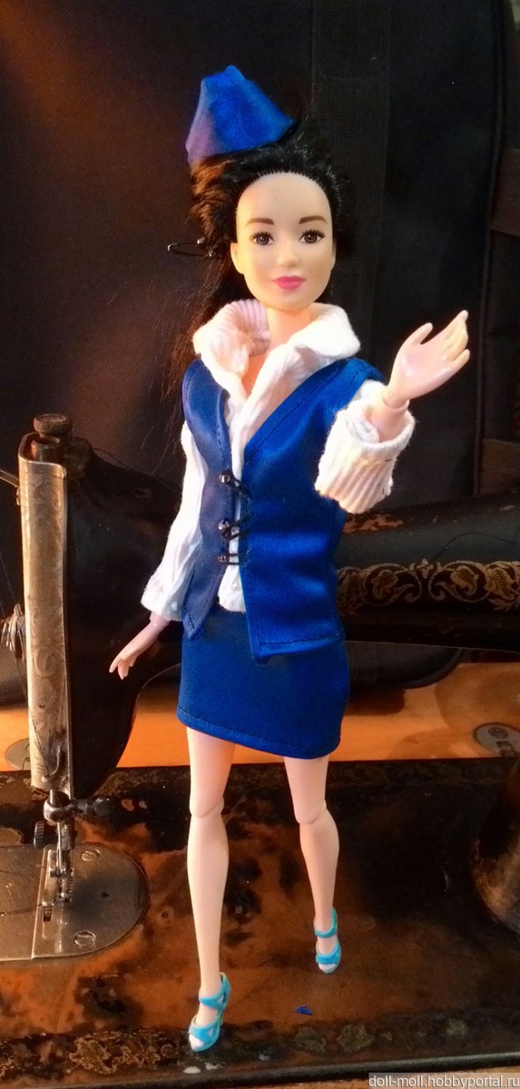 Жилет и юбка синего цвета. Жилет на пуговках из бисера, петельки - из чёрных шерстяных ниток. Юбка сзади на липучке. Жилет и юбка не тянутся. Рубашка белого цвета, отлично тянется. Есть пуговки-обманки из бисера впереди и на рукавах, надевается легко через ноги. Пилотка в комплект не входит, это антураж)).