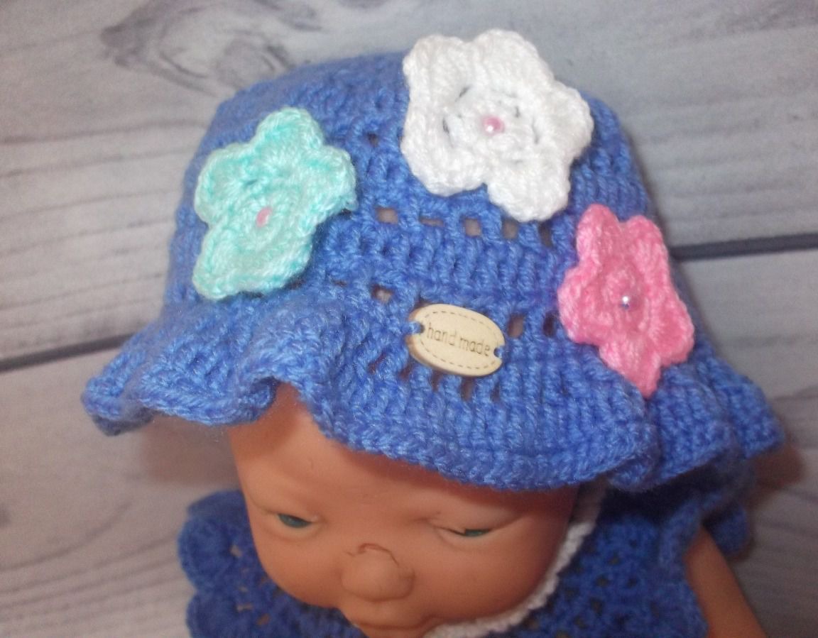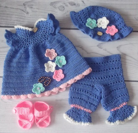 Летний костюм: панамка, туника, штанишки и сандалии.