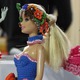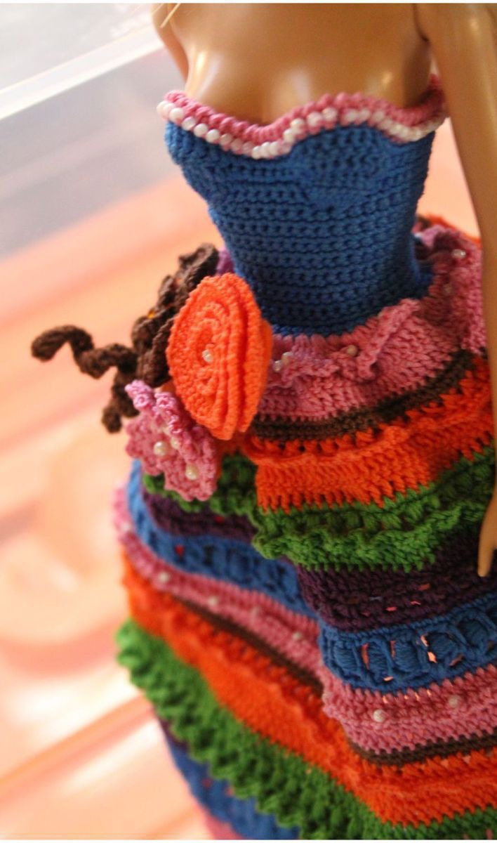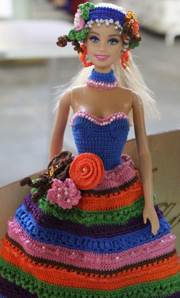 Одежда для Барби выполнена из х/б ниток крючком 0.6 мм. Комплект состоит из платья, повязки на голову и бархотки, все обвязано бисером. Платье украшено брошью. Застежка на липучке.