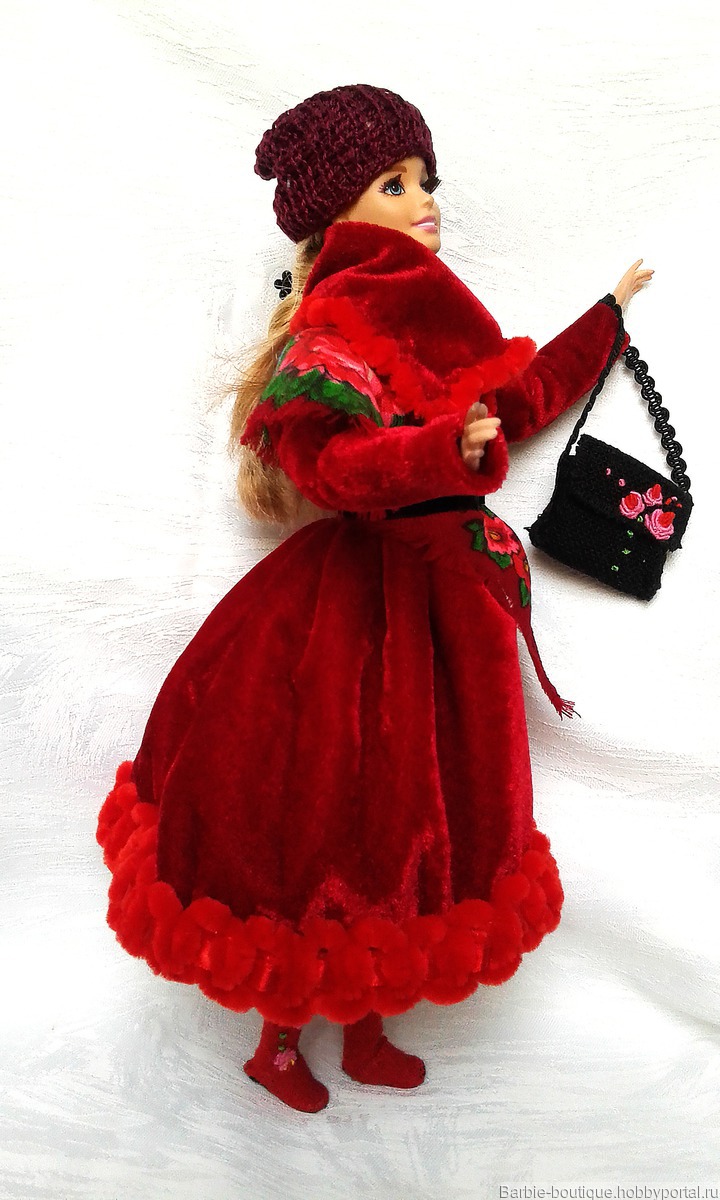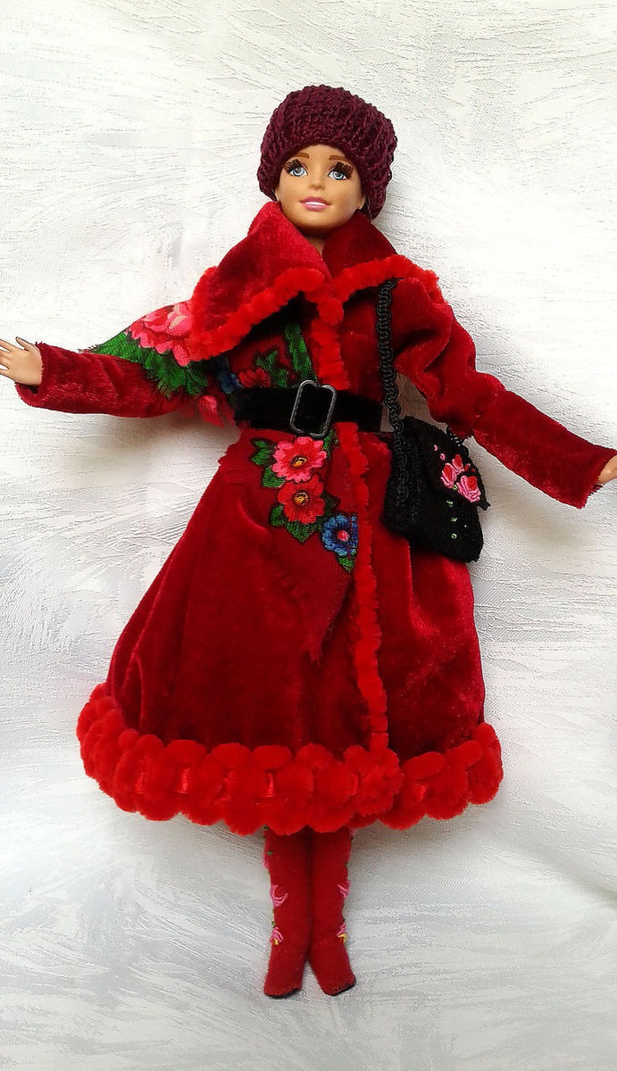 бордовый, обувь для куклы, одежда для кукол, сумка ручной работы, шапочка вязаная, шапочка для куклы, сумка через плечо, одежда для барби, пальто для куклы, фольклорный стиль, сапоги для куклы, сумка для куклы, вышивка рококо