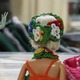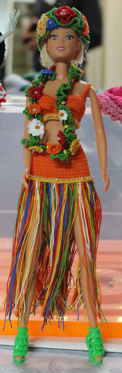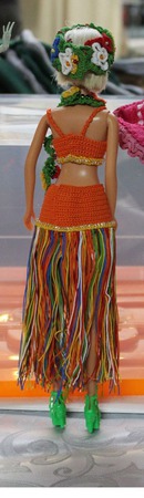 Комплект одежды для Барби выполнен из х/б ниток крючком 0,6 мм. Состоит из топа, юбки и головного убора-повязки, ожерелья из цветов. Юбка украшена бисером и бахромой из нитей. Головной убор застегивается на кнопку, украшен бисером. Топ и юбка застегиваются на липучку