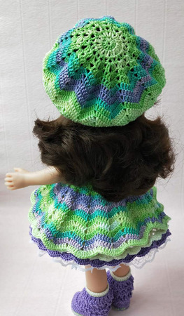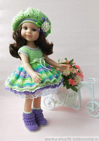 Комплект состоит из красивого платья с двойной юбочкой, нижней юбочки, сапожек и береточки, украшенной цветочком. Наряд связан из качественного хлопка, крючком. Платье полураспашное, на кнопочках.