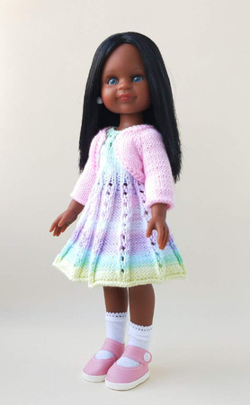 Наряд состоит из платья нежной расцветки (распашное на пуговичках), нижней юбочки и жакетика-балеро на куколку 2015-2017 гг (на теле 2018 г. туговато). Связано спицами из качественной пряжи (хлопок, микрофибра).