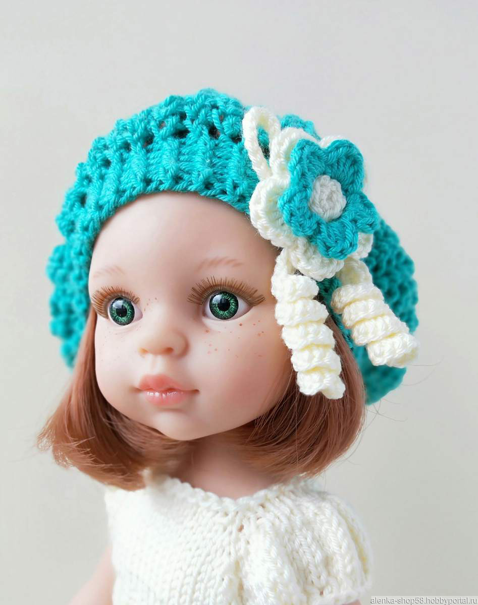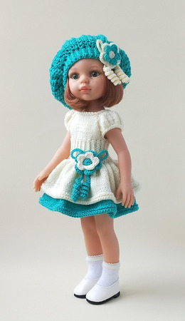 Комплект состоит из красивого платья с двойной юбочкой и береточки, украшенных цветочками. Платье полураспашное, на пуговичках. Связано спицами из мягкой нежной пряжи (микрофибра). Подходит на куколок 2015-17 гг и куколок с 2018 г.