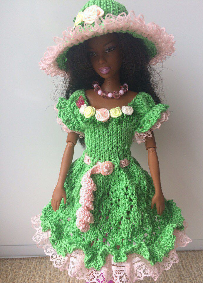 Нарядное платье, шляпка крючком, платье, одежда для куклы, одежда для кукол, платье вязаное, платье нарядное, ярко-зеленый, платье для куклы, наряд для куклы, платье для барби, одежда для барби, наряд для Барби, шляпка для куклы