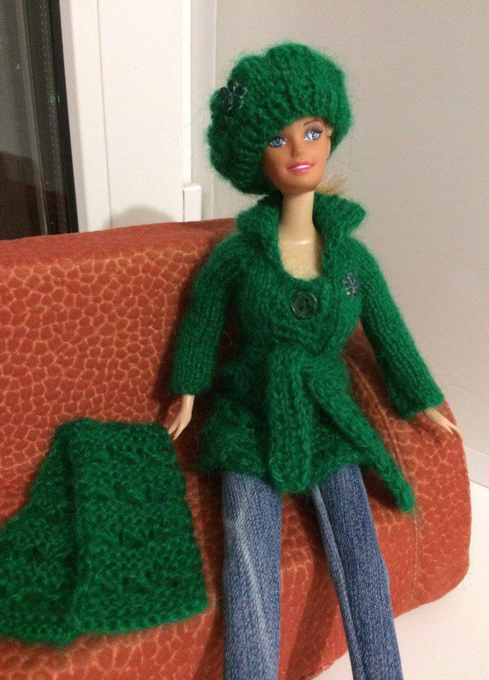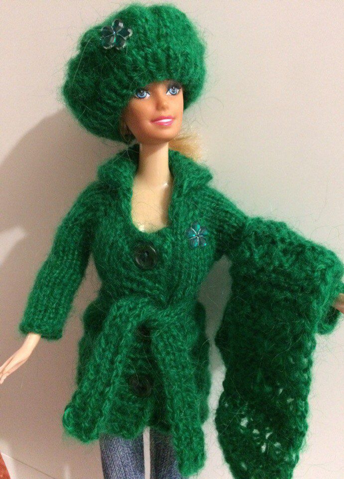 Вязаный комплект для куколки Барби,в комплект входит: кардиган с пояском,берет,шарф.Весь комплект связан на спицах из полушерстяной пряжи(или возможна другая пряжа).украшен пришивными стразами.Кардиган застёгивается на пуговки,что очень легко в обращении.