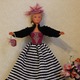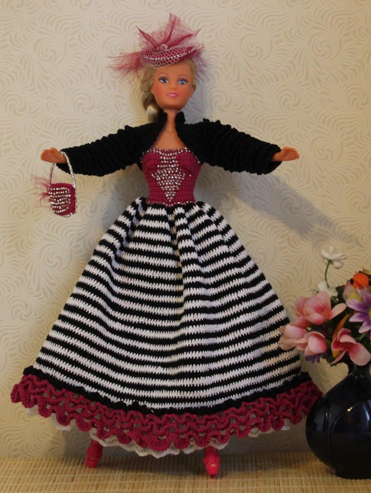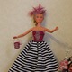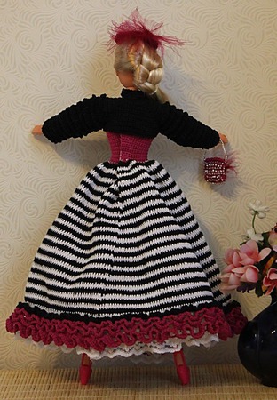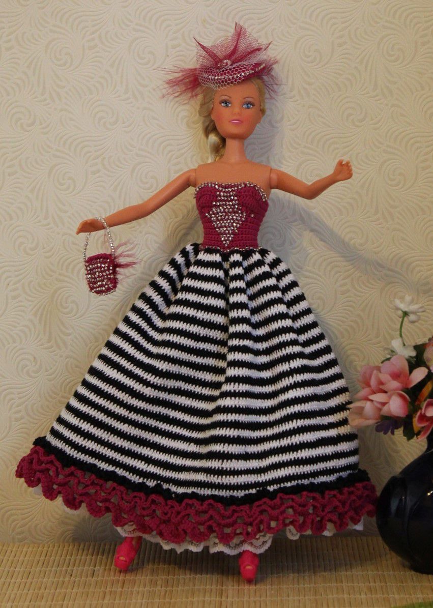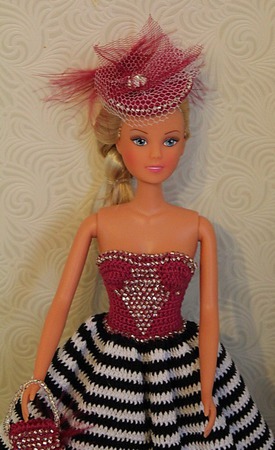Комплект одежды для барби связан крюком из х/б ниток. Комплект состоит из платья, болеро, сумочки, шляпки. Низ платья отделан кружевом. Платье, сумочка и шляпка щедро украшены бисером. Застежка платья на липучке