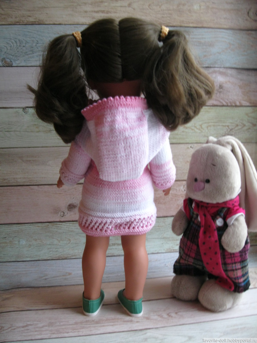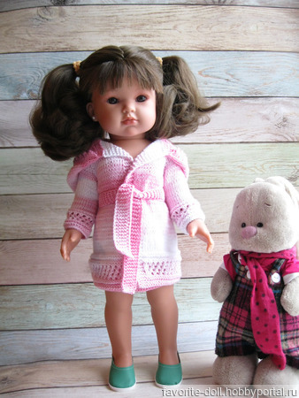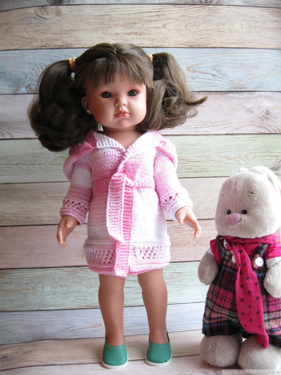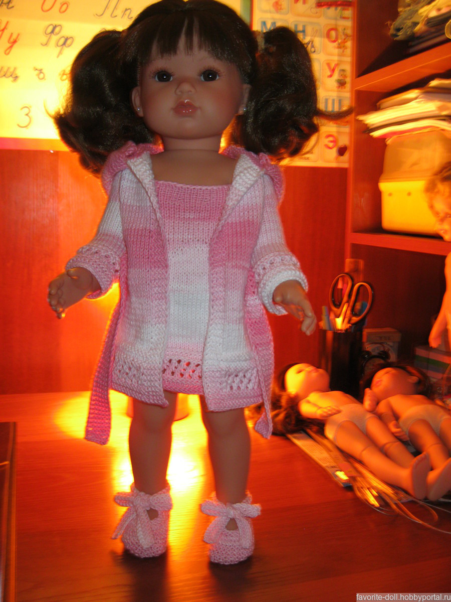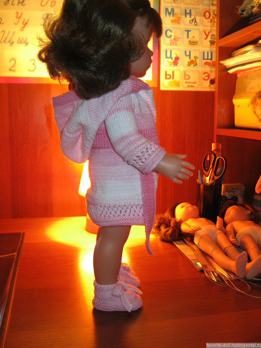 Вязанный комплект одежды для куклы ростом 45 см (Белла, Готц и т.п.). В комплект входят: халатик с поясом и капюшоном, сорочка и тапочки.