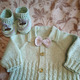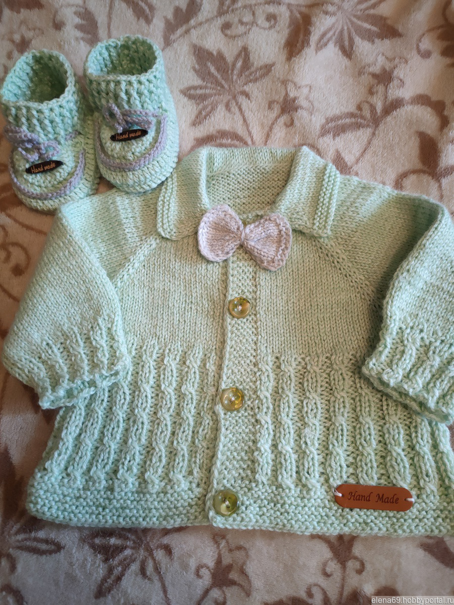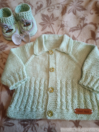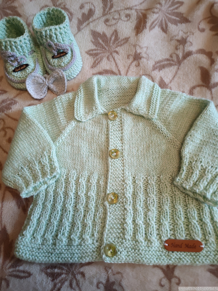 Комплект для новорожденного малыша на выписку нежно мятного цвета. Длина кофточки 25 см, ширина по спинке 24 см, длина рукава по внутреннему шву. Длина подошвы пинеток 11 см.