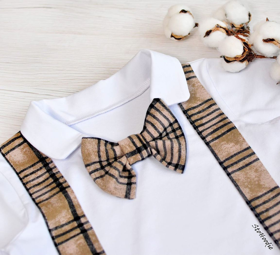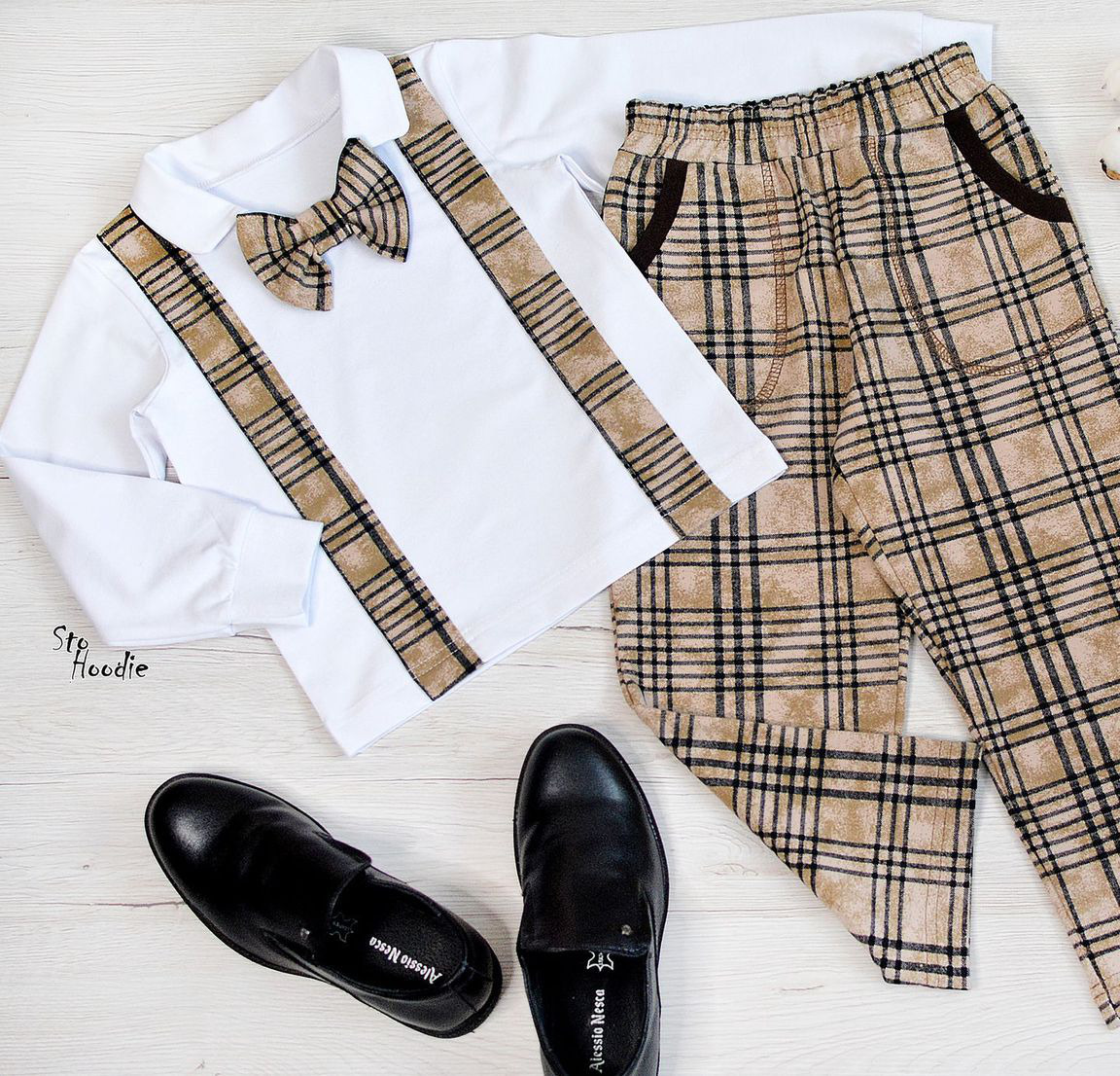 Трикотажный костюм, ткань можно подобрать индивидуально, в зависимости от желаний. Имитация подтяжек, возможен вариант галстука.