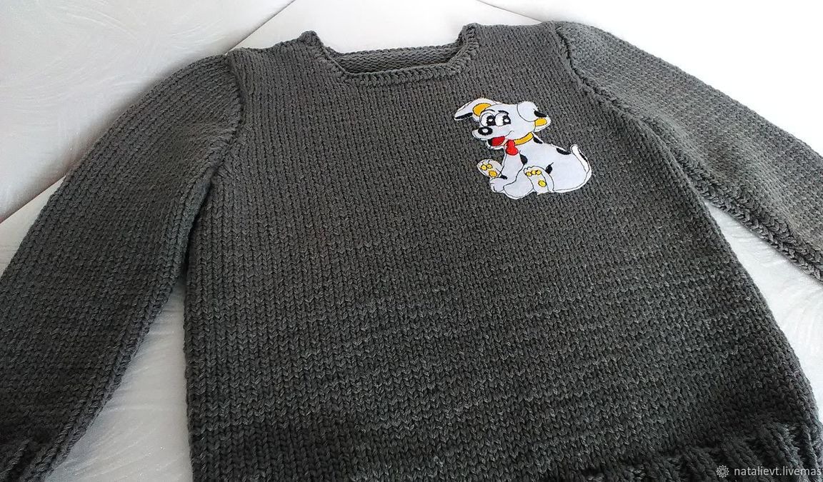 Свитер выполнен из мягкой неколючей немцкой шерстяной пряжи, украшен апликацией "Собачка" - символ 2018 года.