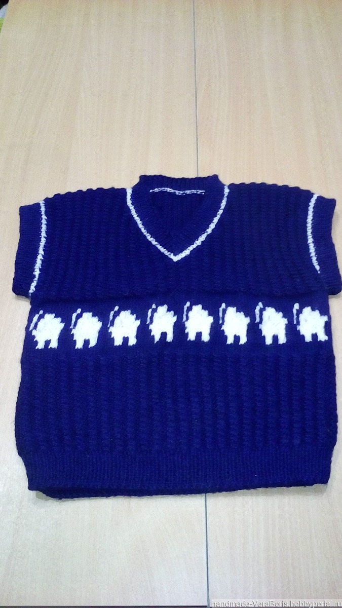 орнамент, подарок мальчику, подарок на новый год, подарок на день рождения, стильный, жилет вязаный, темно-синий, согреет в холод, окантовка, узор со слониками, фактурный узор