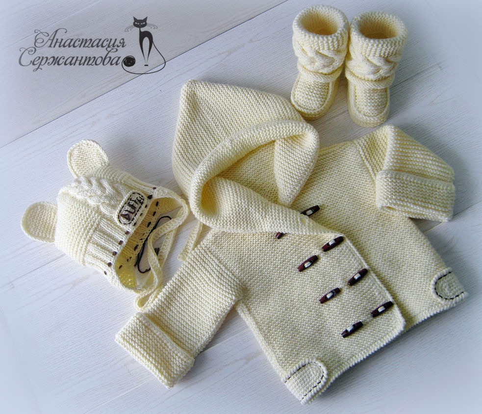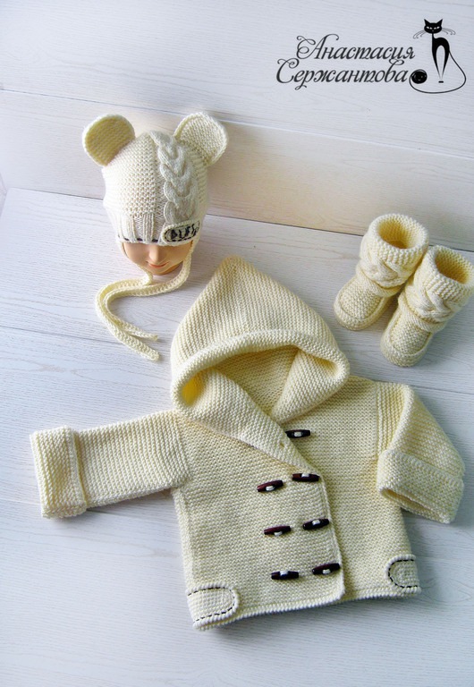 для девочки, вязание, для мальчика, пальто вязаное, ручная авторская работа, на весну, шапочка вязаная, комплект вязаный, на осень, для малышей, вязаные сапожки, молочный, пинетки сапожки, жакет дюффель, анастасия сержантова, Вязаная курточка