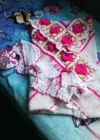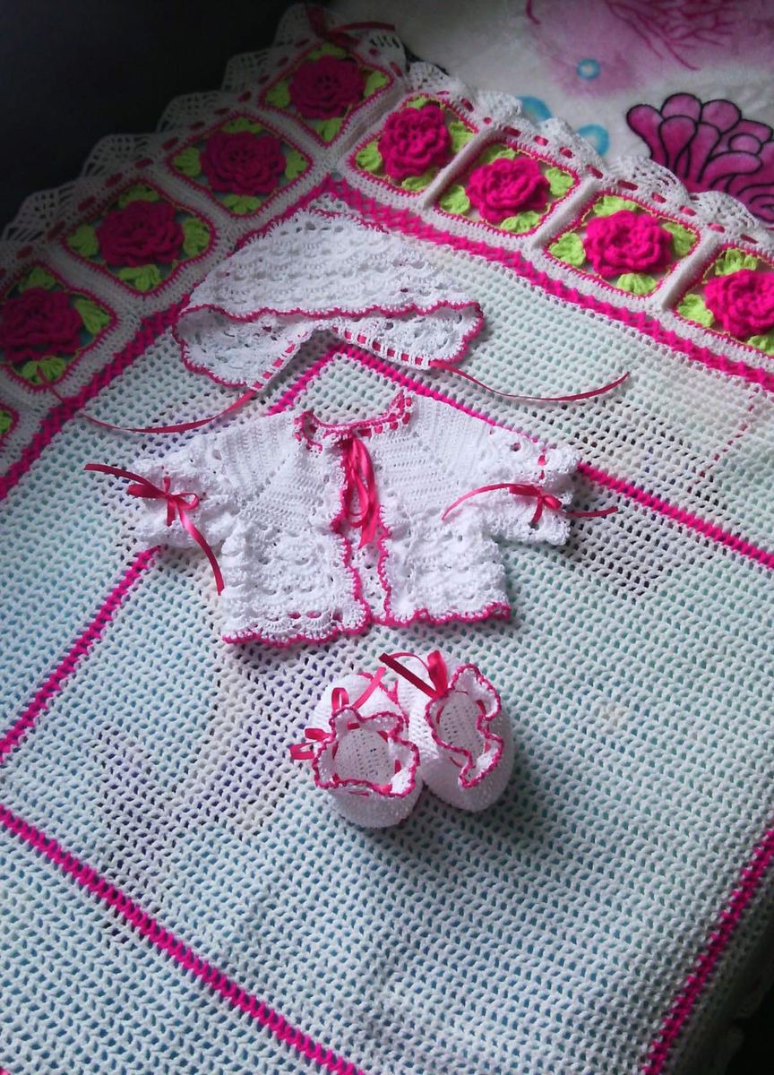 Комплект на выписку для новорожденной. выволнен в бело розовой цветовой гамме. Связан из хлопка.Украшен атласной лентой. Можно к комплекту добавить штанишки По вашему желанию можно выполнить любую цветовую гамму.