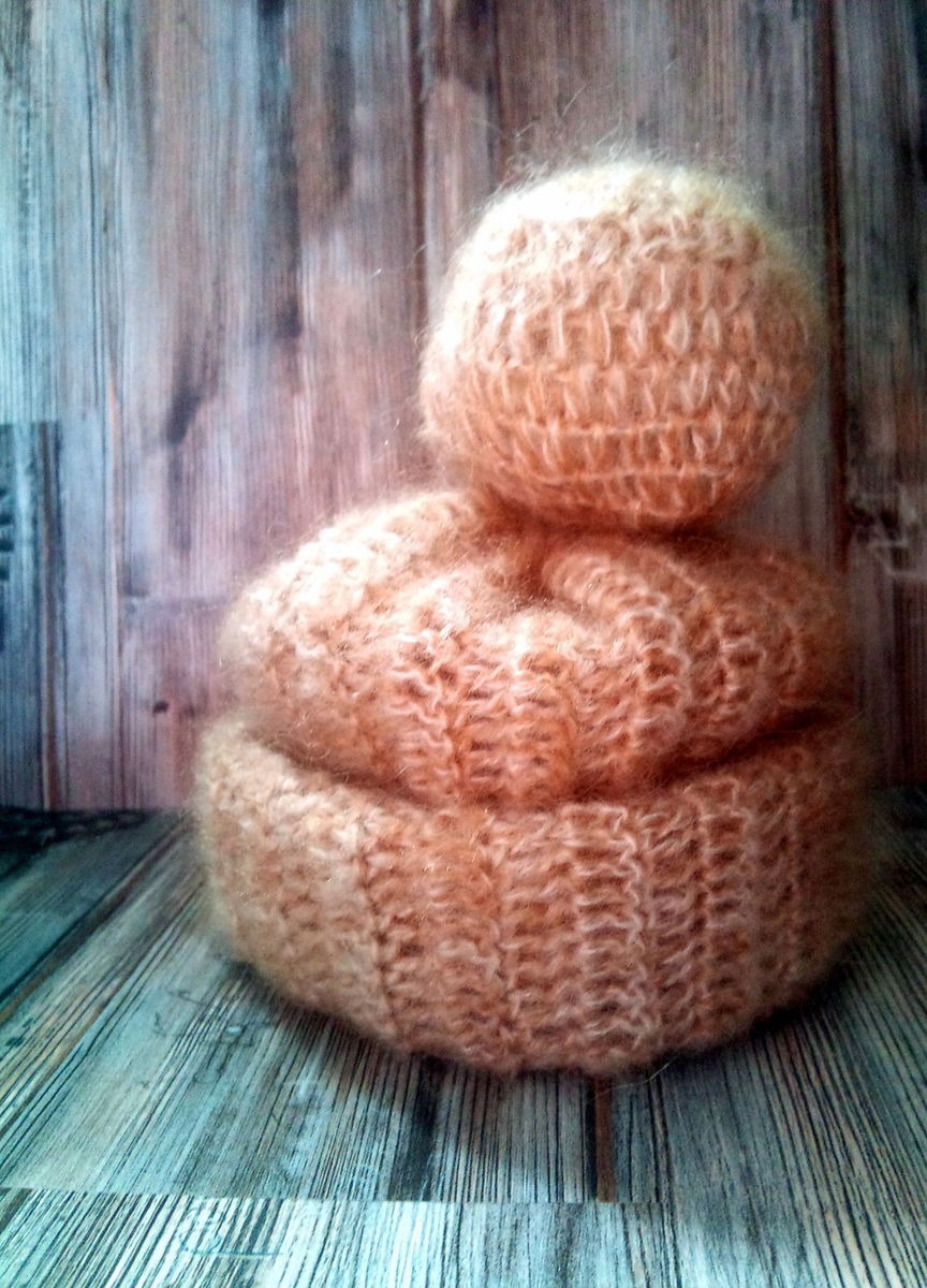 Шапочка для фотосессии, а вернее, три варианта одной шапочки: без помпона, с вязаным помпоном в цвет шапочки или с меховым помпоном рыжего цвета. Все помпоны легко прикрепляются и открепляются. Ещё можно раскатать отворот шапочки - а это ещё три варианта)))
