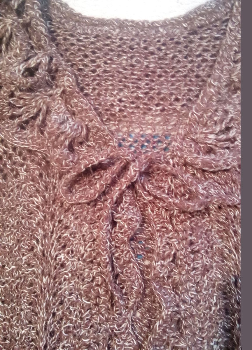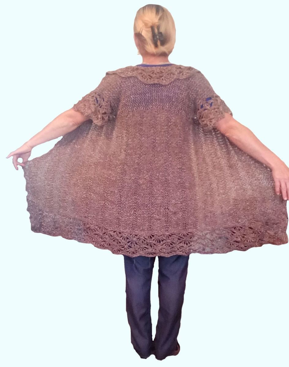 Очень нежный , уютный и практически невесомый. Воротничок, полочки и рукава обвязаны крючком.