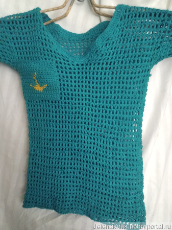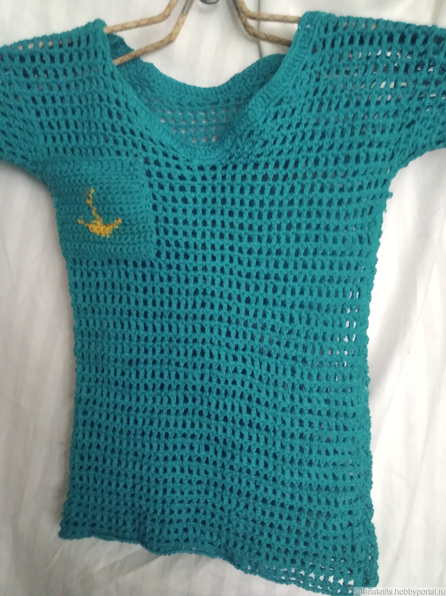 Вязаная футболка ручной работы для мальчика 2-3 лет. Цвет морской волны.