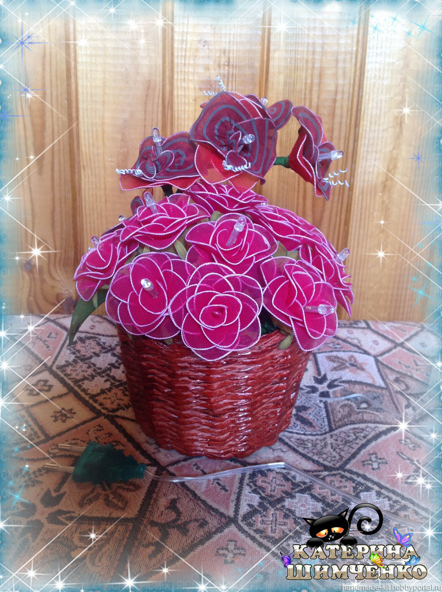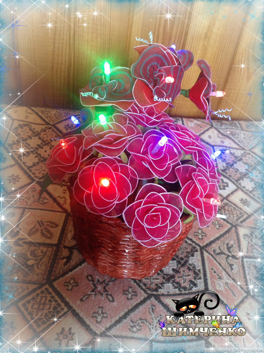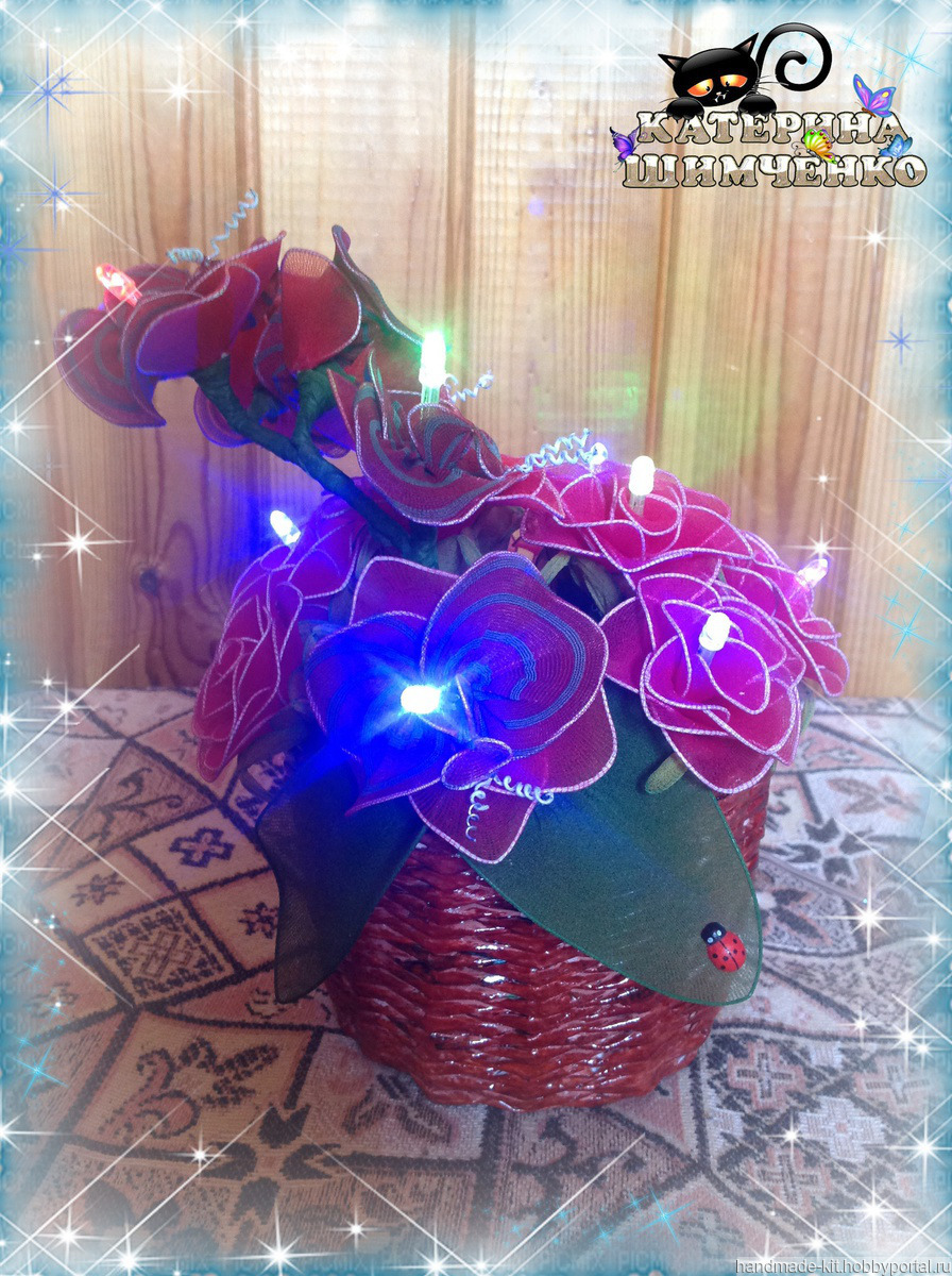 Ночник состоит из 10 красных роз и веточки орхидеи (5 цветков). За счёт проволочного каркаса цветам, листьям и стеблю можно придавать любой изгиб.