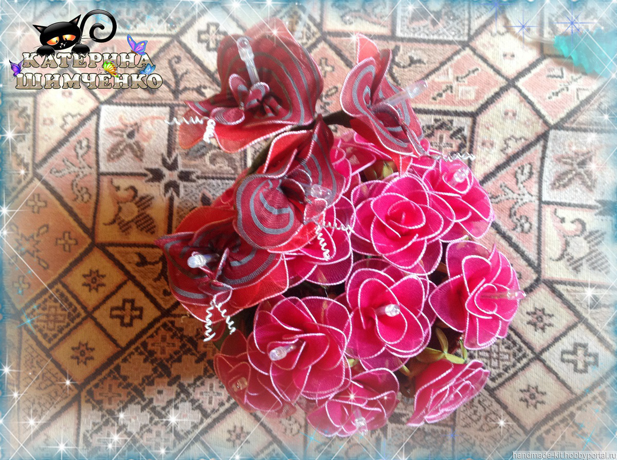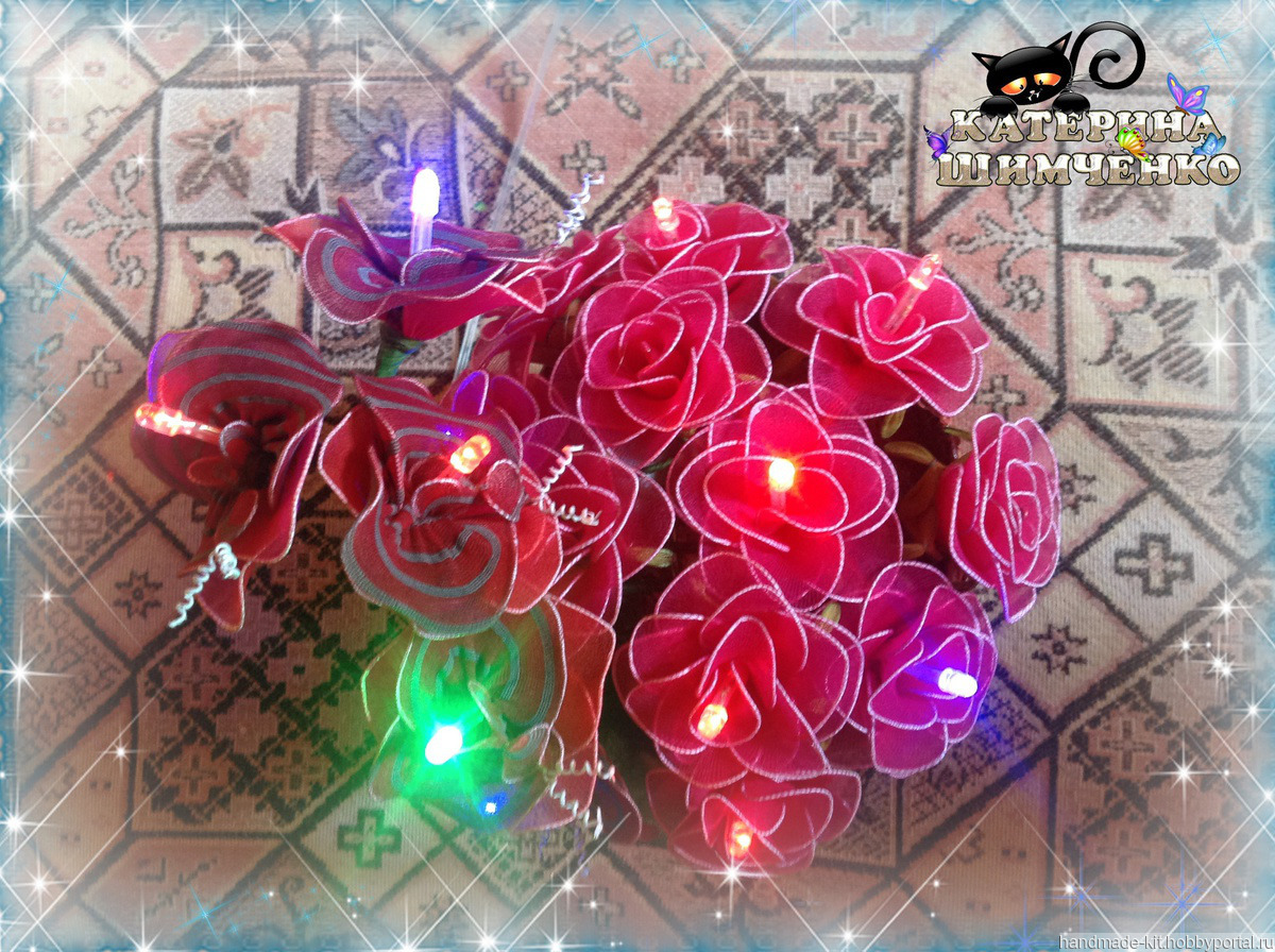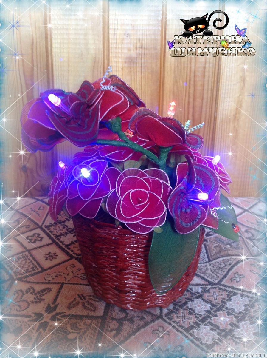 Ночник состоит из 10 красных роз и веточки орхидеи (5 цветков). За счёт проволочного каркаса цветам, листьям и стеблю можно придавать любой изгиб.