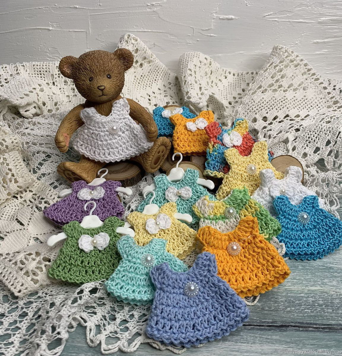 Вязаный декор стал очень популярен в скрапбукинге. Он служит прекрасным украшением и дополнением в разных композициях. Такие миниатюрные платья придадут особый уют и тепло любой вашей работе. Разнообразная цветовая гамма.
