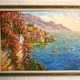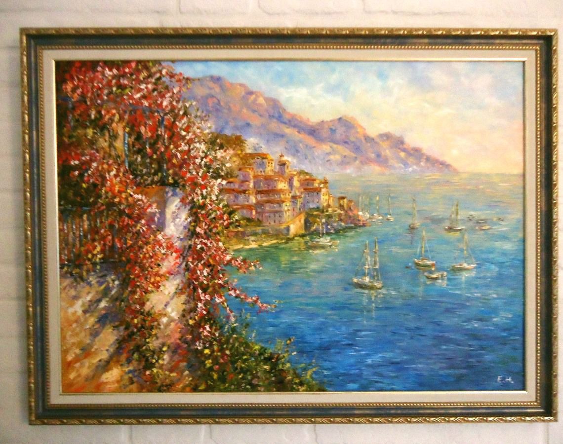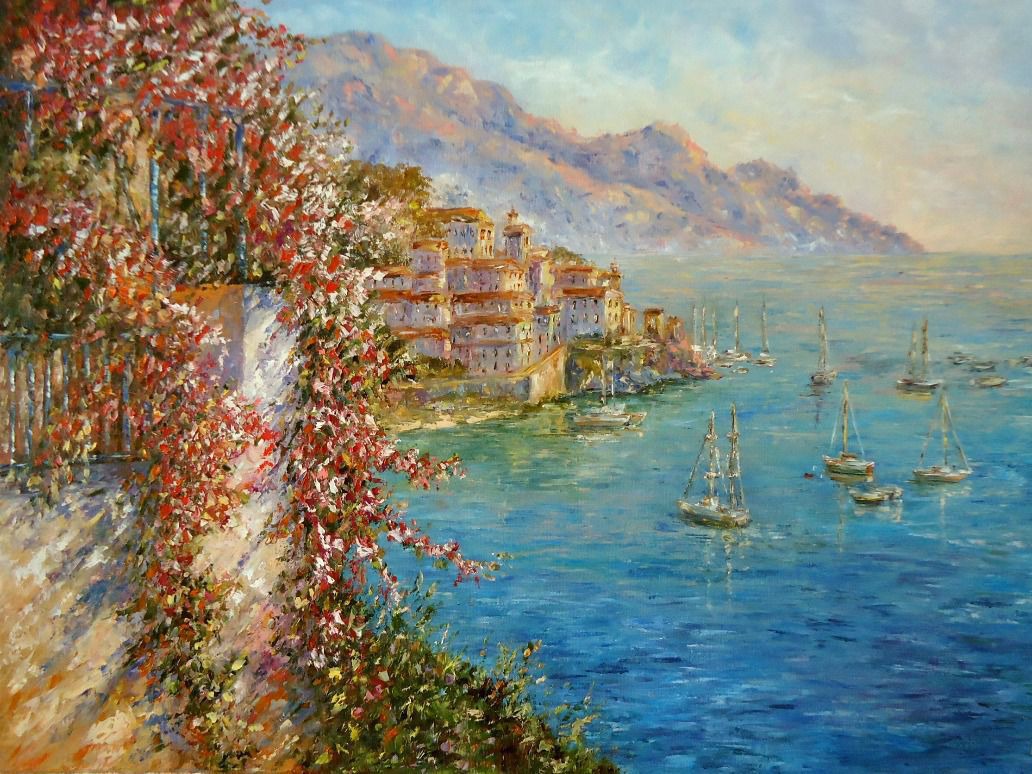 голубой, море, синий, цветы, темно-бирюзовый, картина для интерьера, картина в подарок, горы, зелень, картина маслом, морской пейзаж, интерьерная картина, Масляная живопись, живопись маслом, картина на холсте, берег, набережная, лодки, солнечный пейзаж