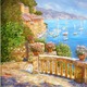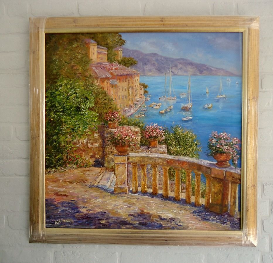 голубой, море, дерево, синий, цветы, темно-бирюзовый, картина для интерьера, картина в подарок, зелень, картина маслом, морской пейзаж, интерьерная картина, Масляная живопись, парусник, живопись маслом, картина на холсте, берег, картина без рамы, набережная, солнечный пейзаж