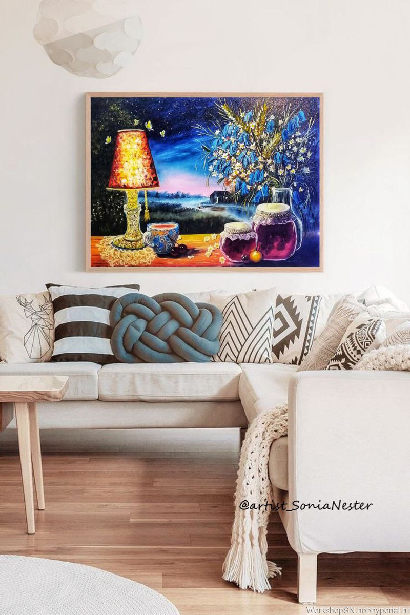 картина для интерьера, живопись маслом, холст на подрамнике, вечерний пейзаж, картина на холсте, река туман берег, масло