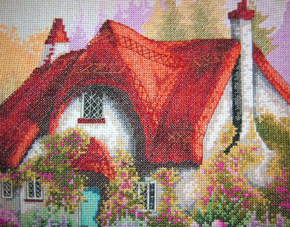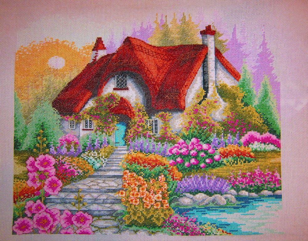 Эта вышивка фирмы "Белоснежка".Очень нежная и сказочная картина получилась.То ли это домик гномов,то ли еще каких-то сказочных персонажей..Ну или просто чисто английский домик,утопающий в цветах..Все равно прелестно.Думаю,что станет незабываемым подарком и для взрослых,и для детей.