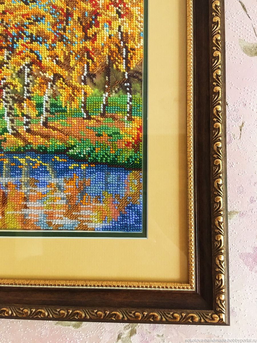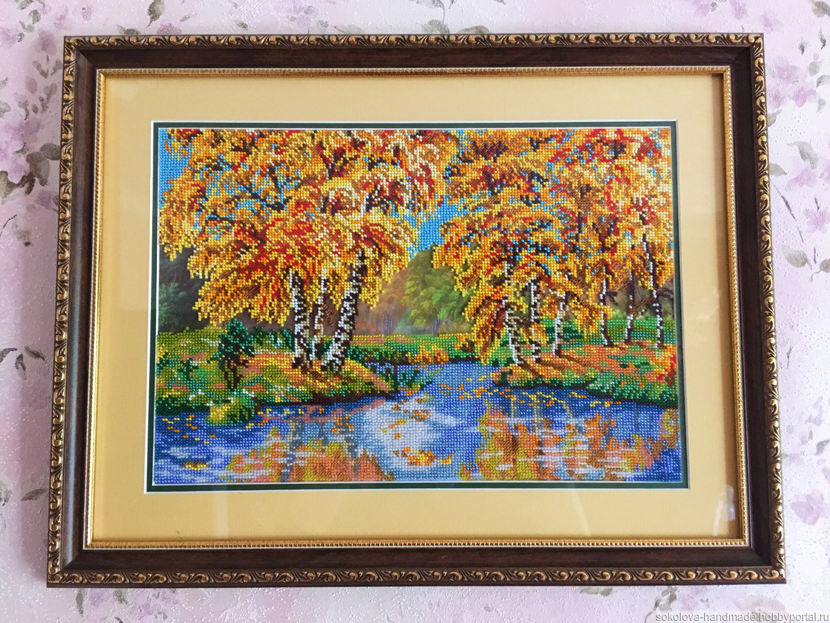 бисер, вышивка бисером, вышивка, подарок, осень, картина, пейзаж, картина бисером, лес, бисер чешский, река, осенний лес