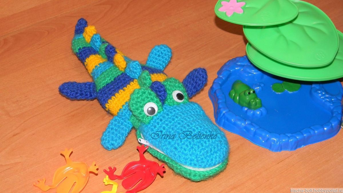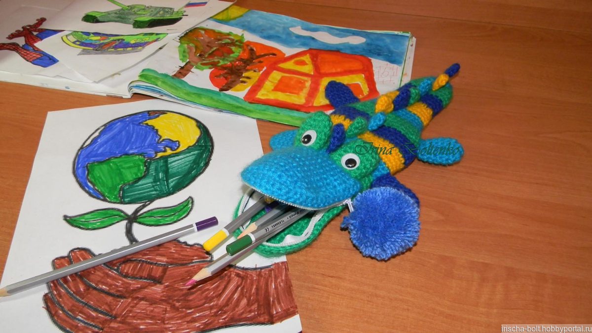 Смешной и яркий друг для вашего ребенка. И конечно же хранитель карандашей и фломастеров. Пенал "Крокодильчик" связан из 100% акрила. Размер: около 25 см.
