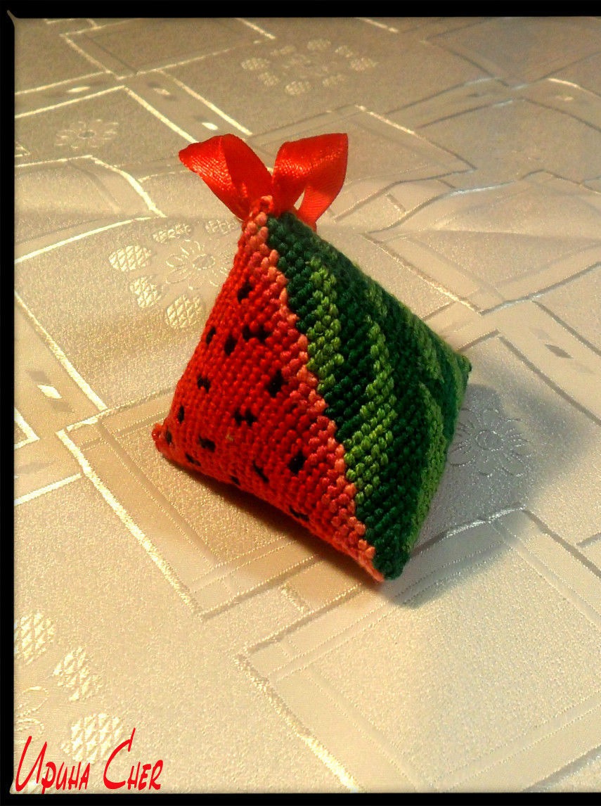 Берлинго "Арбузная долька", может использоваться в качестве игольницы, елочной игрушки, брелочка. Выполнена в технике счетный крест на канве 14ct, мулине Гамма в три нити, бэк-стич в три нити; 7 оттенков; размер ребра пирамидки: 6см; наполнитель - синтепон
