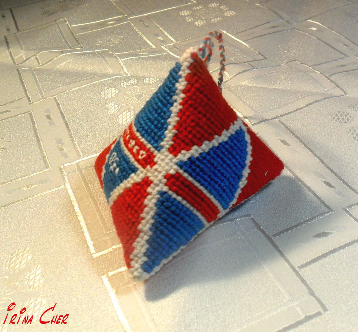Берлинго - французское слово. А по-русски это вышитая пирамидка. Красивая стильная штучка! Премилейший, изысканный подарочек, с петелькой вверху для подвешивания, может быть игольницей.