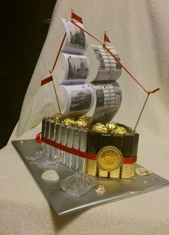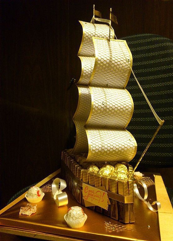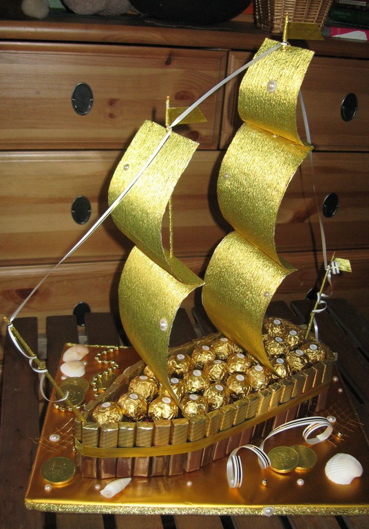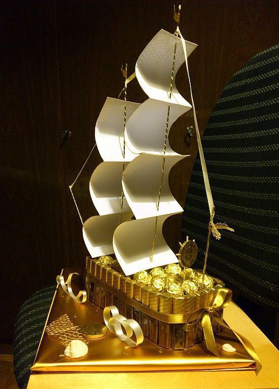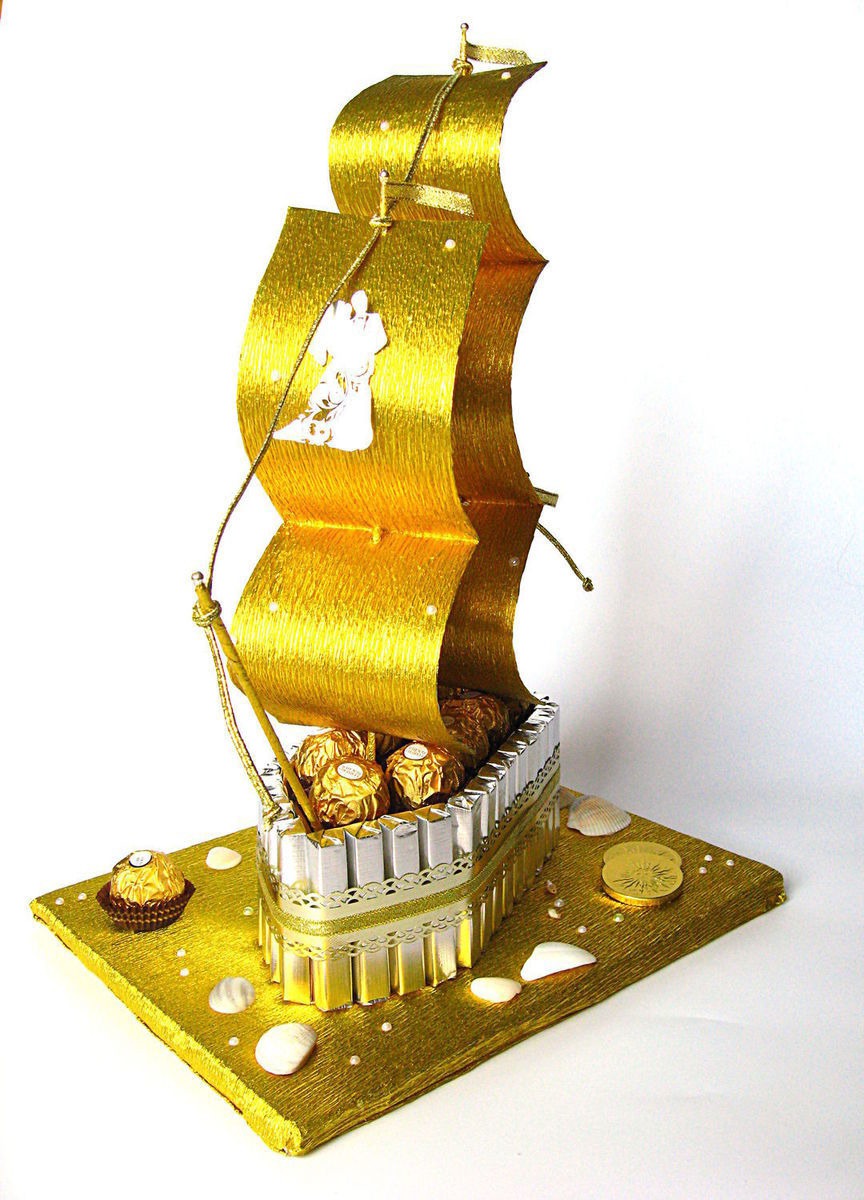 кораблик, корабль, золотой, оригинальный подарок, подарок женщине, подарок, юбилей, подарок на любой случай, подарок мужчине, шоколад, букет из конфет, мужской подарок, корабли, сладкий подарок, вечеринка, композиция из конфет, юбилей свадьбы, корабль из конфет, юбилейный, кораблики