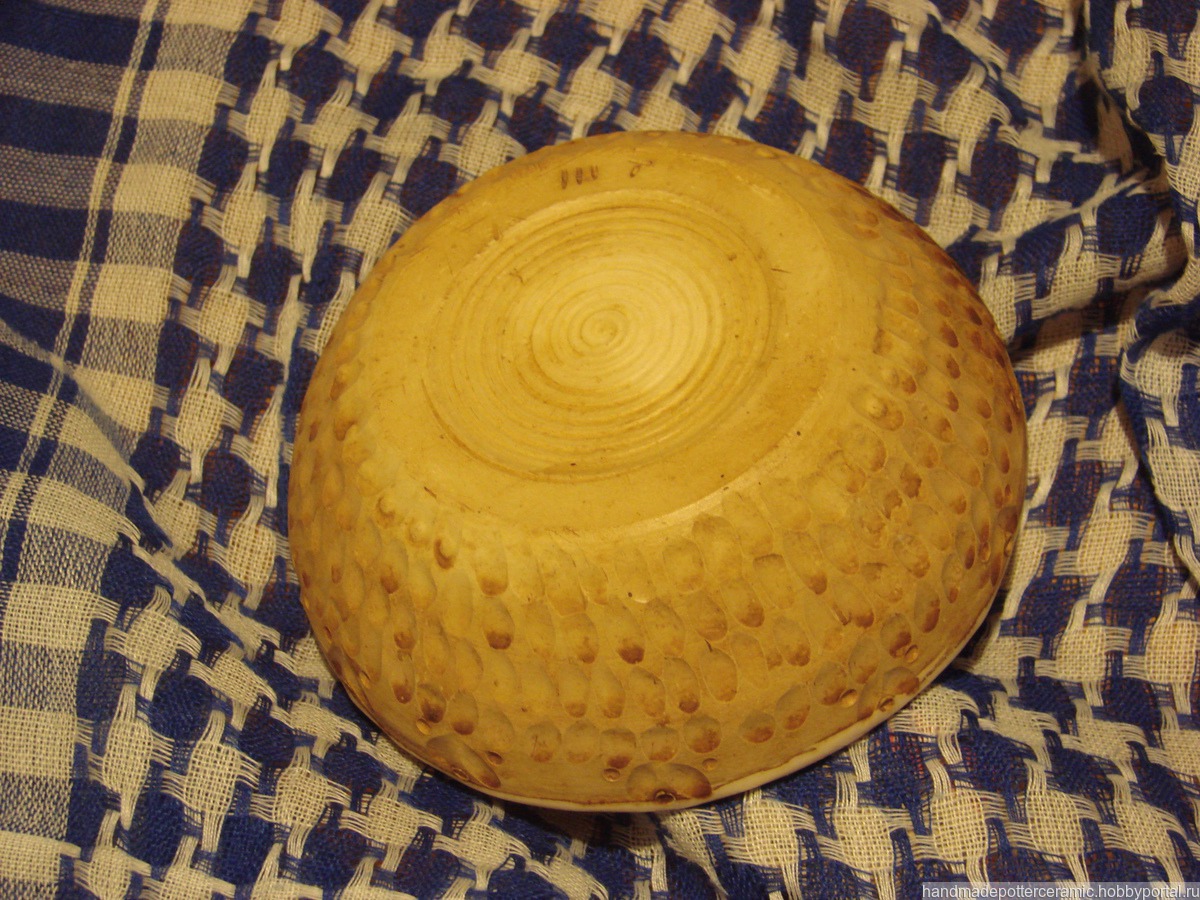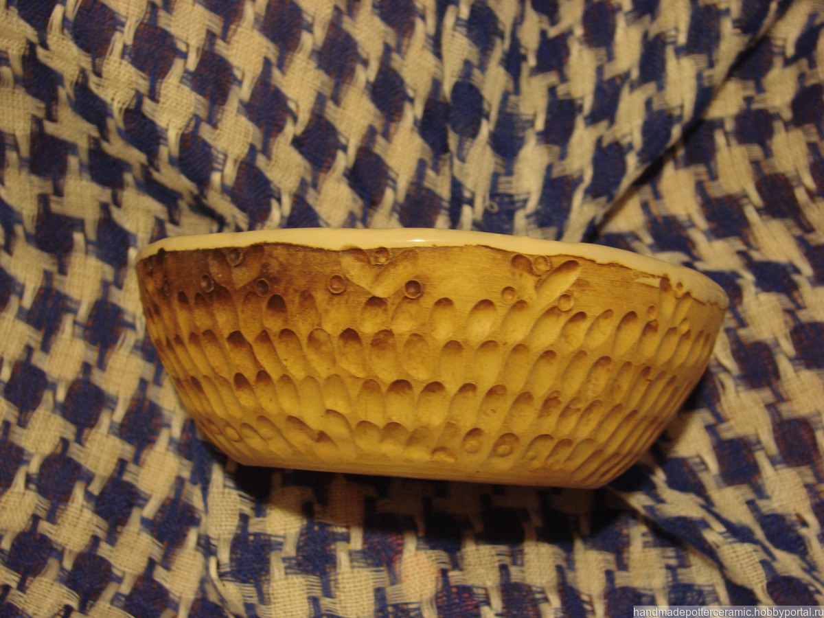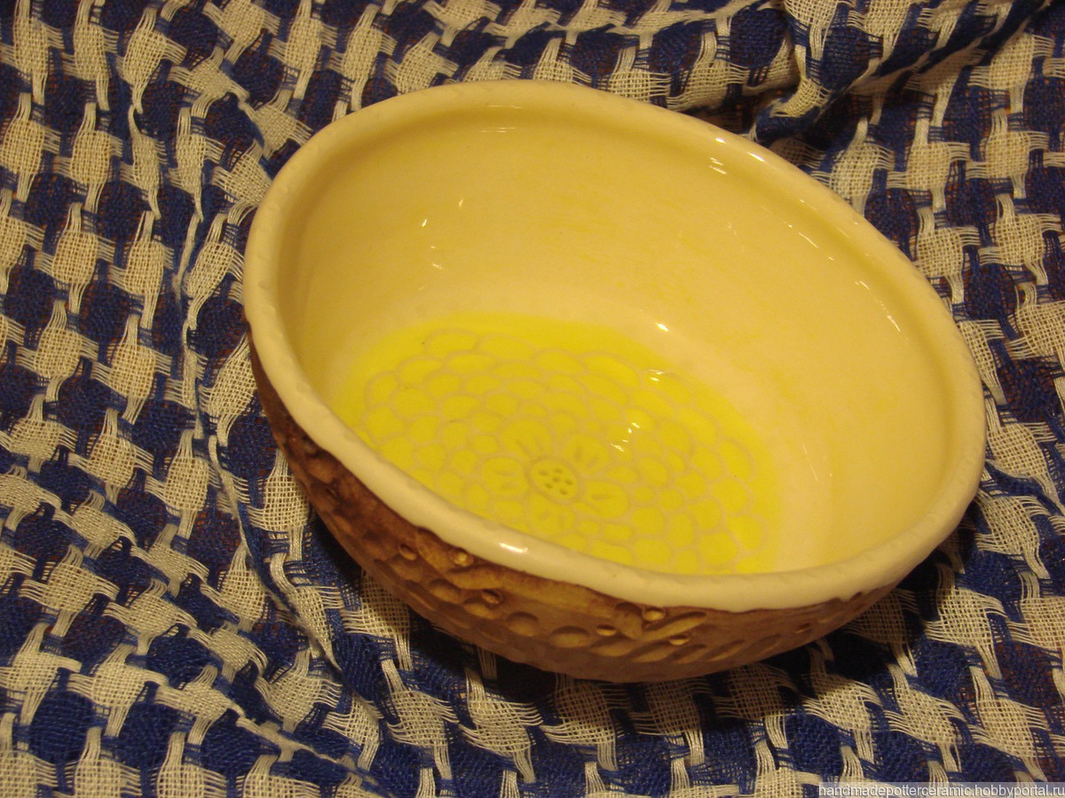 Миска для вкусняшек сделана вручную из глины, внутри покрыта желтым ангобом и декорирована в технике сграффито, снаружи вырезан рельеф и замолочена, донце тоже молоченое (покрыто молоком и обожжено при 350 градусах), из-за этого мыть ее в посудомойке крайне нежелательно.