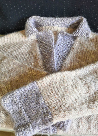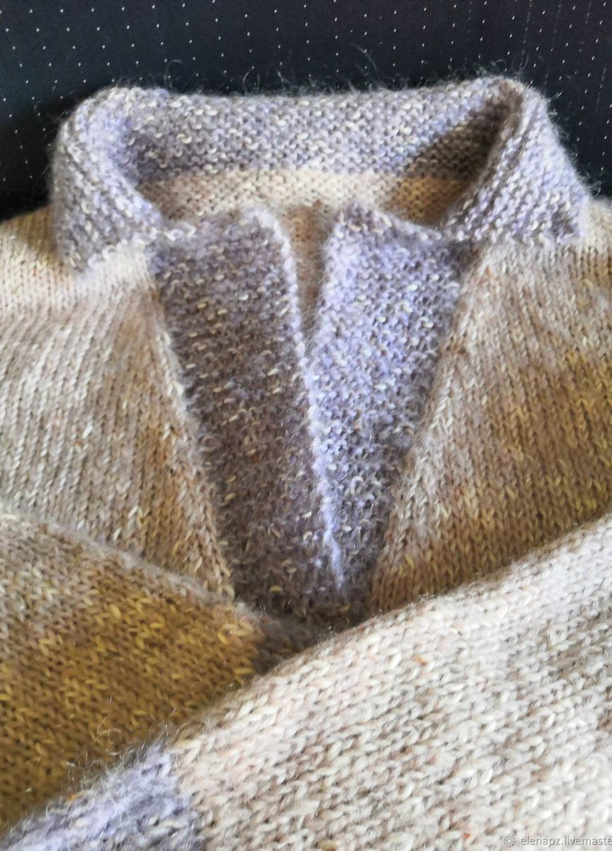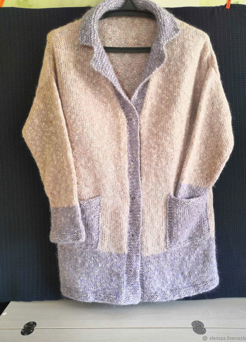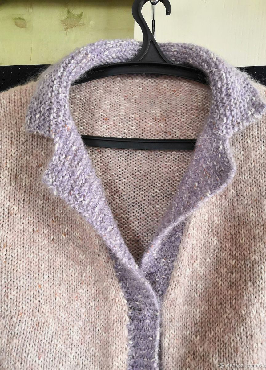 Классический кардиган на пуговицах с английским воротником с 2 карманами .Для лучшей посадки по фигуре вывязаны нагрудные вытачки. Теплый, не колючий. с небольшим пухом.Комбинация пряжи двух цветов одного состава с твидовым эффектом