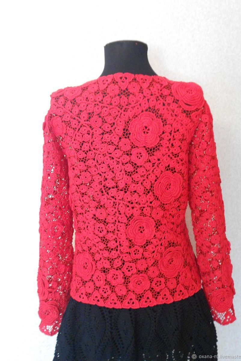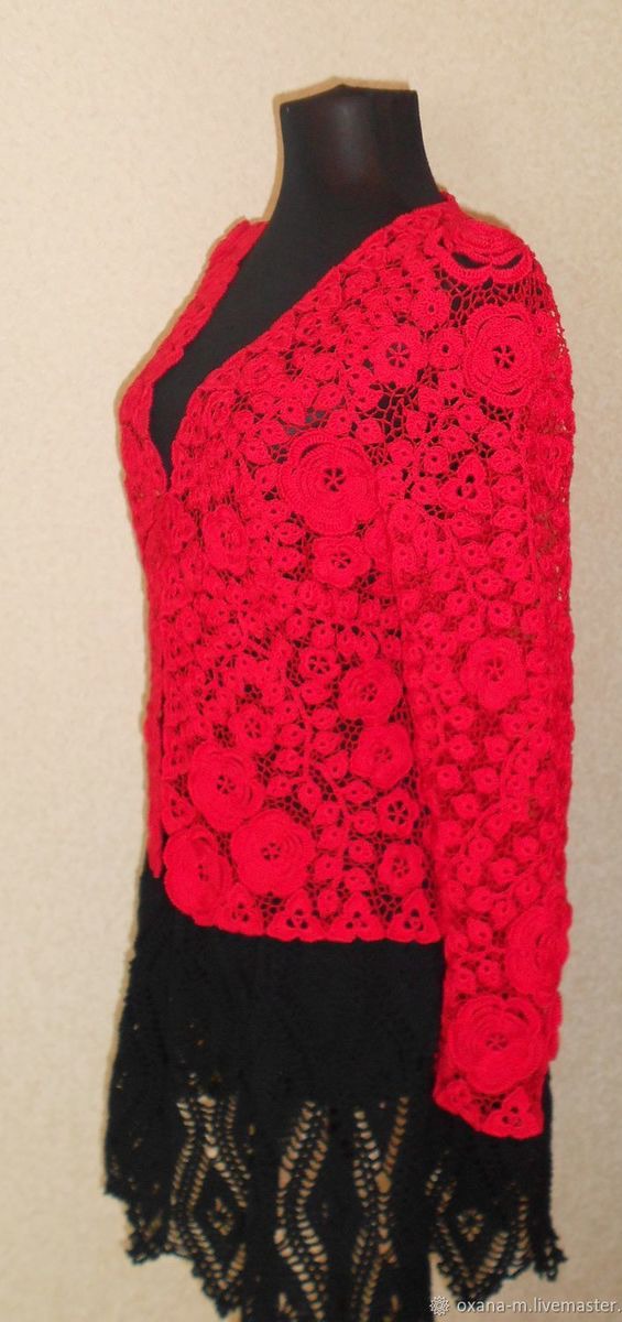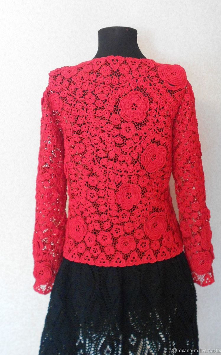Жакет связан из хлопка 100% из двух оттенков: элементы - красного, сеточка - тем.красного цвета, тем самым создавая 3D эффект. Авторская работа.